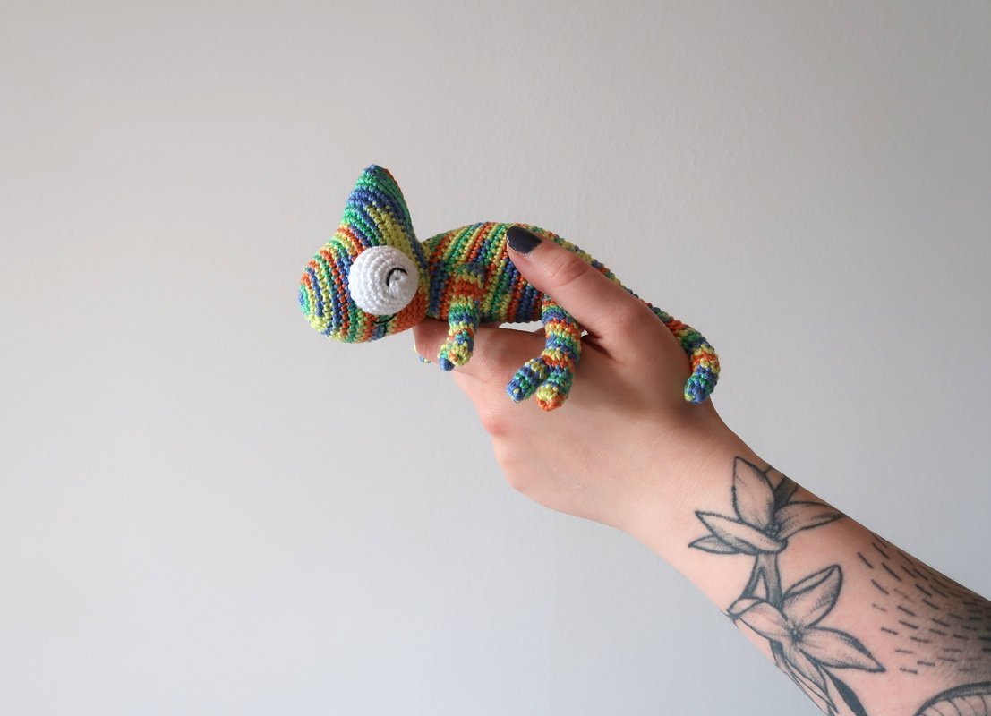 Wenn du mit Baumwolle (125m LL auf 50g) häkelst, wird dein kleines Grinsechamäleon ca. 20cm lang.