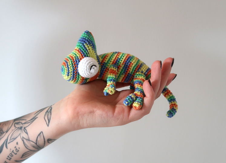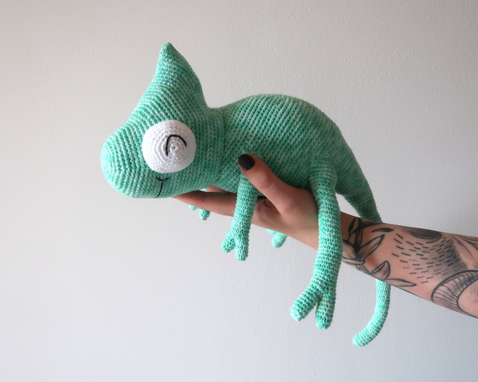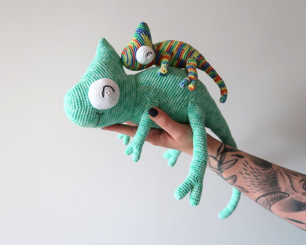 Wenn du mit Baumwolle (125m LL auf 50g) häkelst, wird dein kleines Chamäleon ca. 20cm lang und das große ca. 46cm.