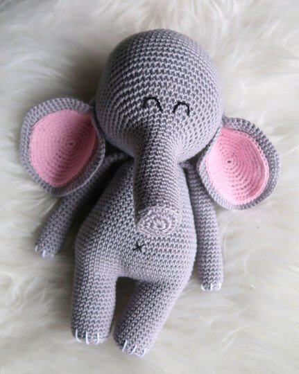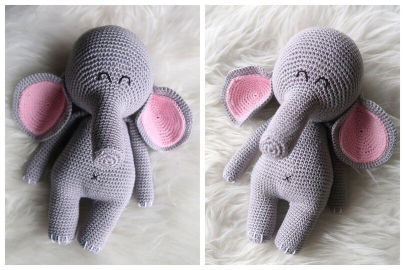 Wenn du mit Baumwolle (125m LL auf 50g) häkelst, wird dein Grinsefant ca. 25cm hoch.