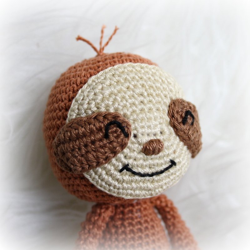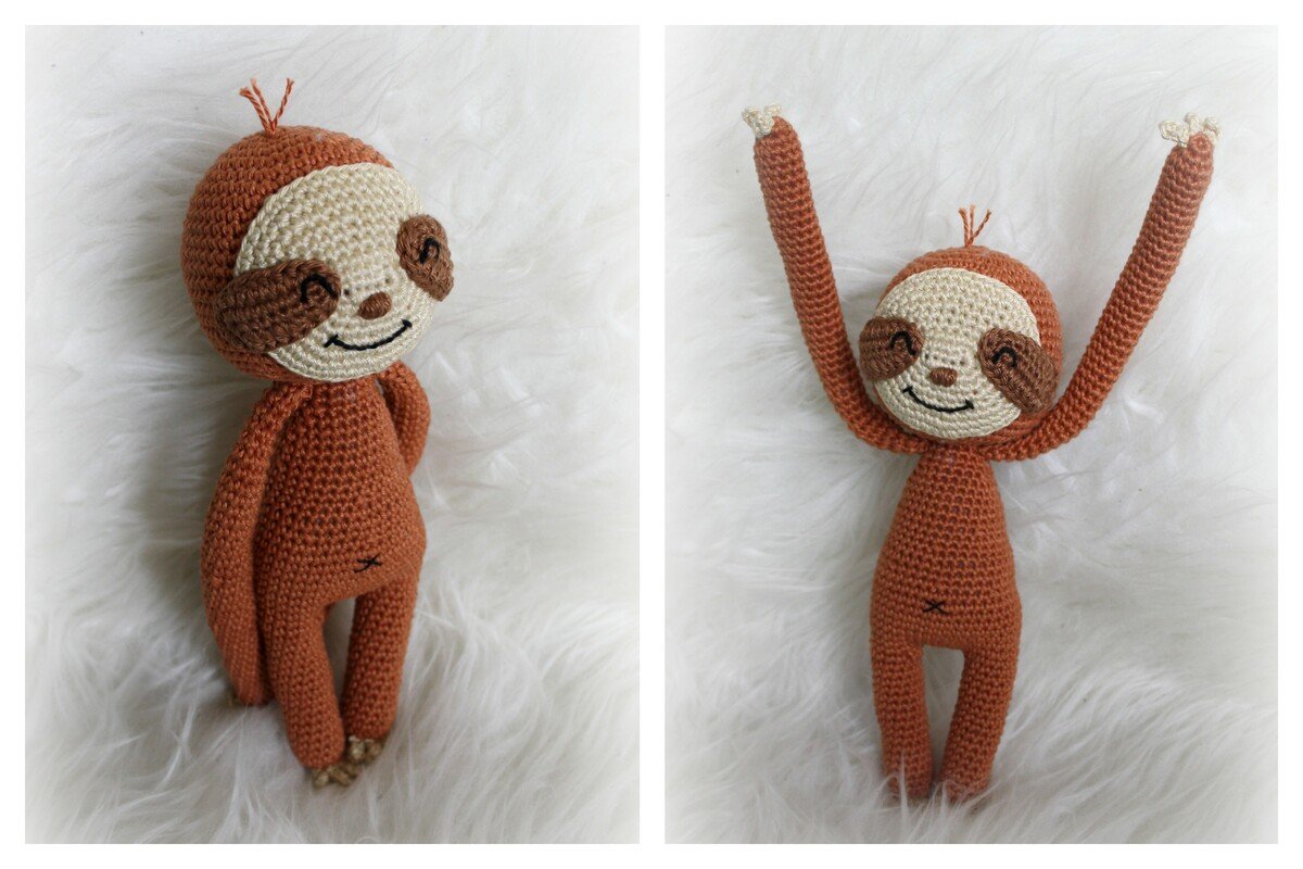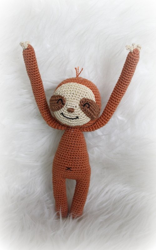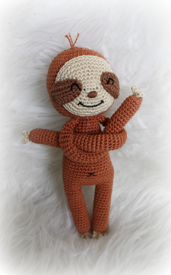 Wenn du mit Baumwolle (125m LL auf 50g) häkelst, wird dein kleines Grinsefaultier ca. 21cm hoch.
