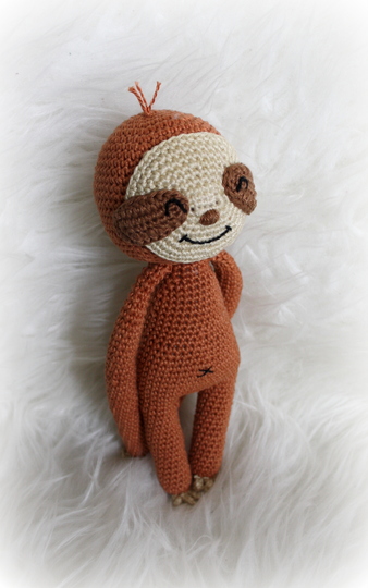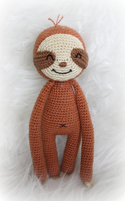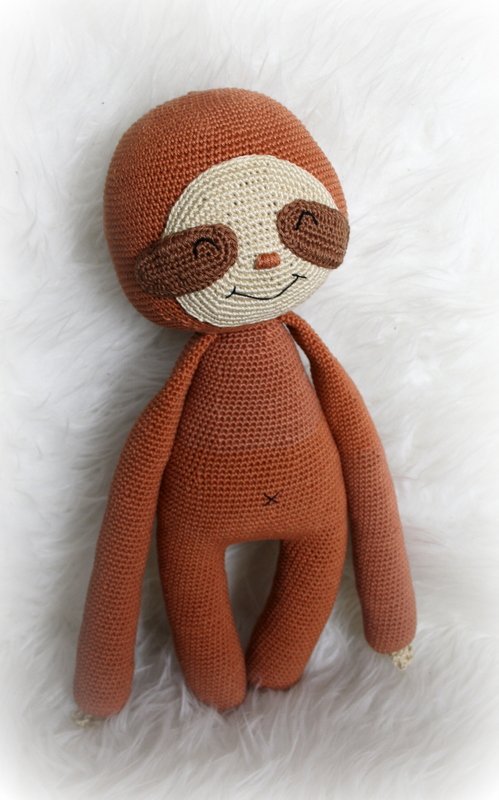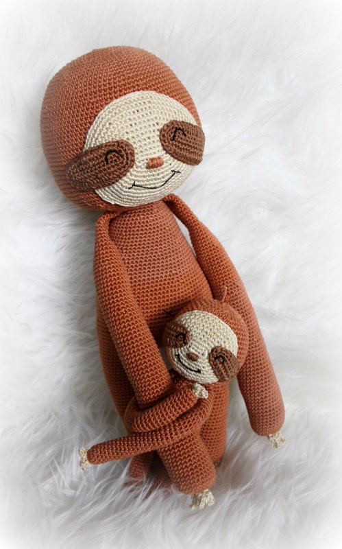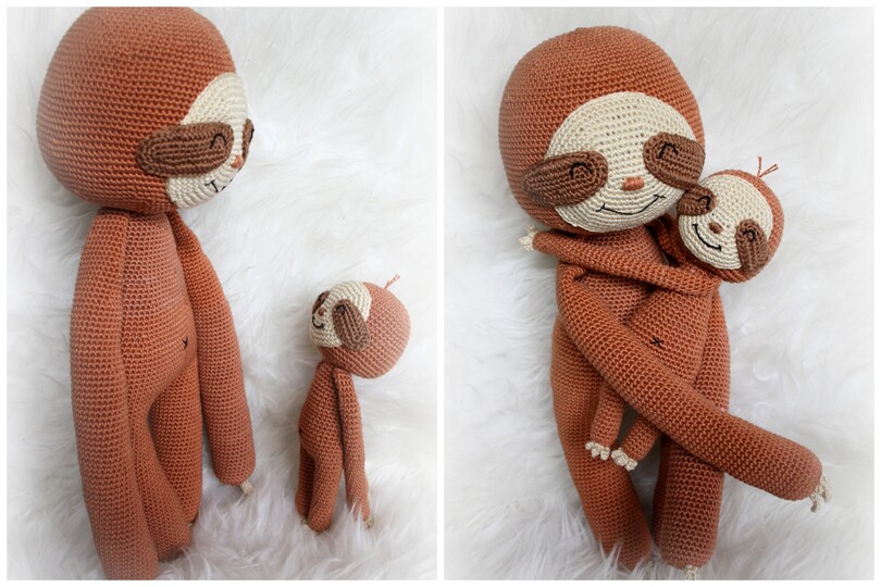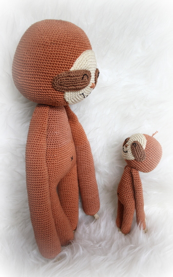 Wenn du mit Baumwolle (125m LL auf 50g) häkelst, wird dein kleines Grinsefaultier ca. 21cm hoch und das große ca. 38cm.