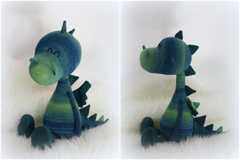 Wenn du mit Baumwolle (110m LL auf 50g) häkelst, wird dein XL-Drache ca. 45cm hoch.