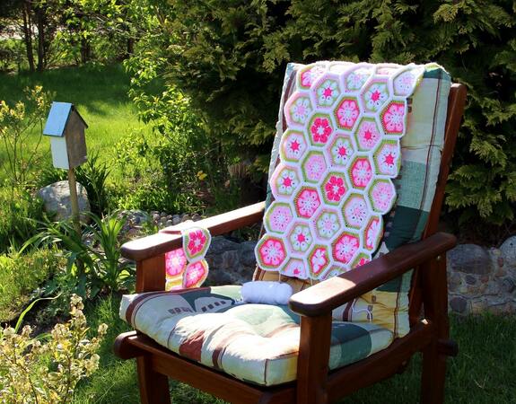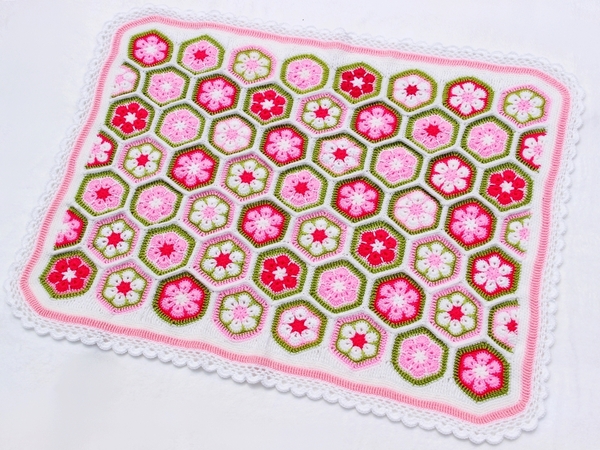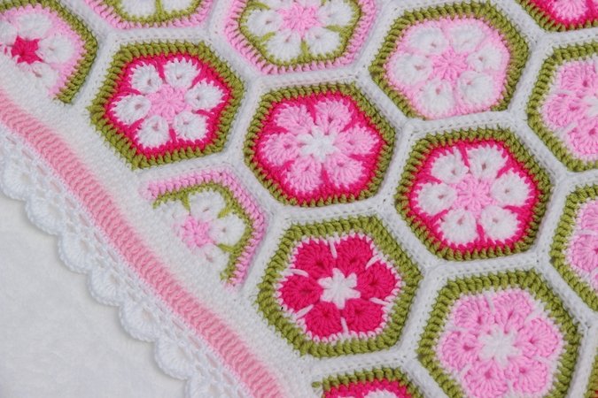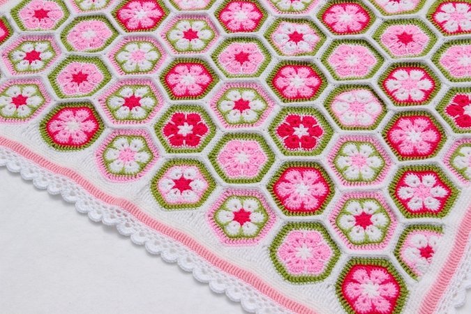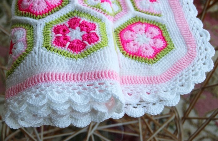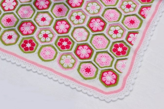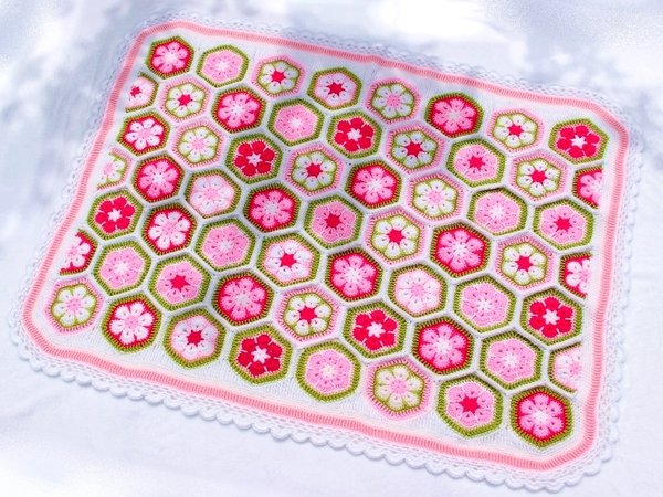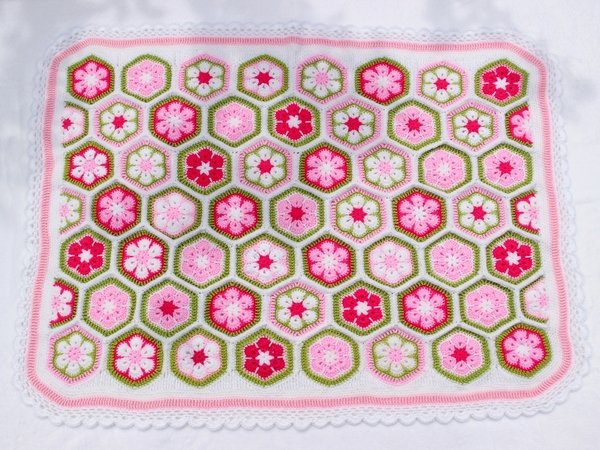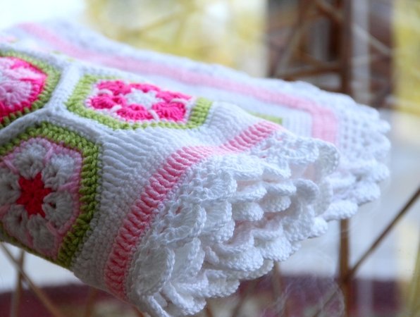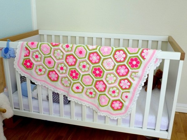 Die Farben der Decke kann man nach Belieben wählen und die Größe der Decke ist variabel. Ihr könnt sie also in allen gewünschten Größen fertigen: für den Kinderwagen, den Autositz, fürs Kinderbettchen, als Spieldecke oder sogar als Tagesdecke fürs Bett. Man muss sich auch nicht gleich für die Endgröße festlegen, sondern sie wächst Stück für Stück und man kann jederzeit beschließen, dass sie nun groß genug ist. Die Machart ist bei jeder Größe gleich und der Rand passt auch für alle Größen. Mustermäßig ist sie leicht zu häkeln, aber man braucht Fleiß und Ausdauer. Dafür wird man aber auch mit einer besonders schönen und einzigartigen Decke belohnt.