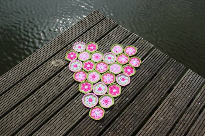 Für die Decke häkeln wir zuerst einzelne ganze und halbe Sechsecke. Das ist damit auch ein schönes "Unterwegs-Projekt. Ihr nehmt Euch einfach eine kleine Tüte mit kleinen Wollknäulen und die Häkelnadel mit - und könnt somit praktisch überall (im Zug, im Urlaub, im Wartezimmer ...) die bunten Sechsecke häkeln. Diese werden später aneinander gehäkelt. Zum Schluss umhäkeln wir die Decke mit einem einfarbigen Schmuckrand.