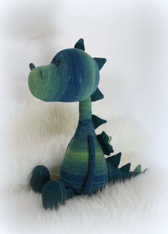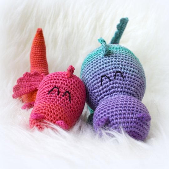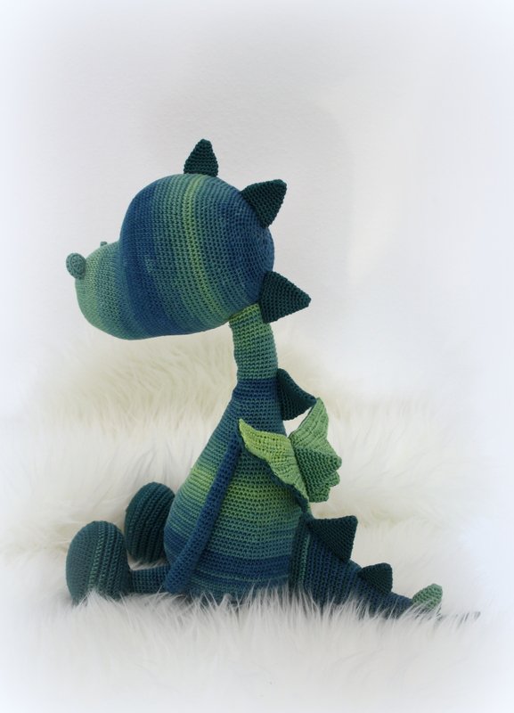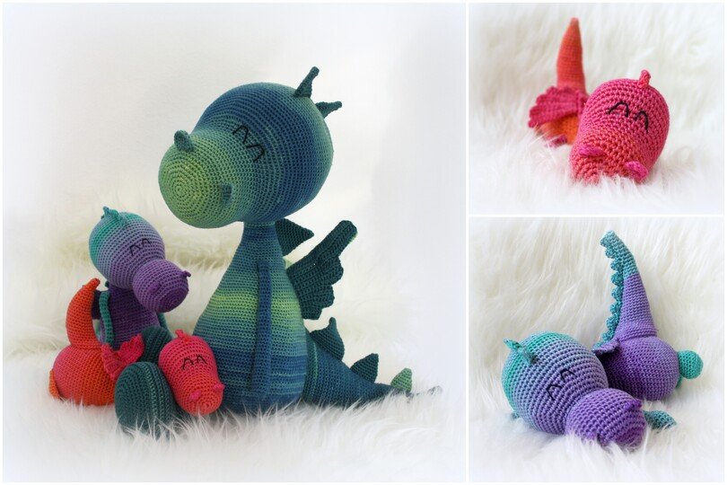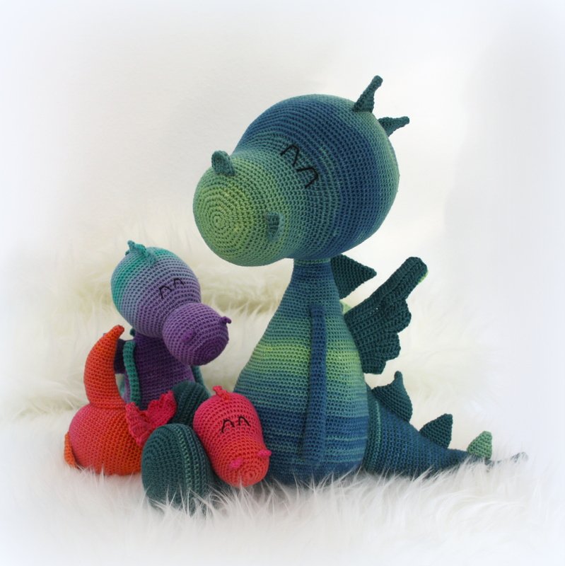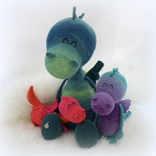 Wenn du mit Baumwolle (110m LL auf 50g) häkelst, werden die kleinen Drachen ca. 24 und 30cm hoch und der XL-Drache ca. 45cm.
