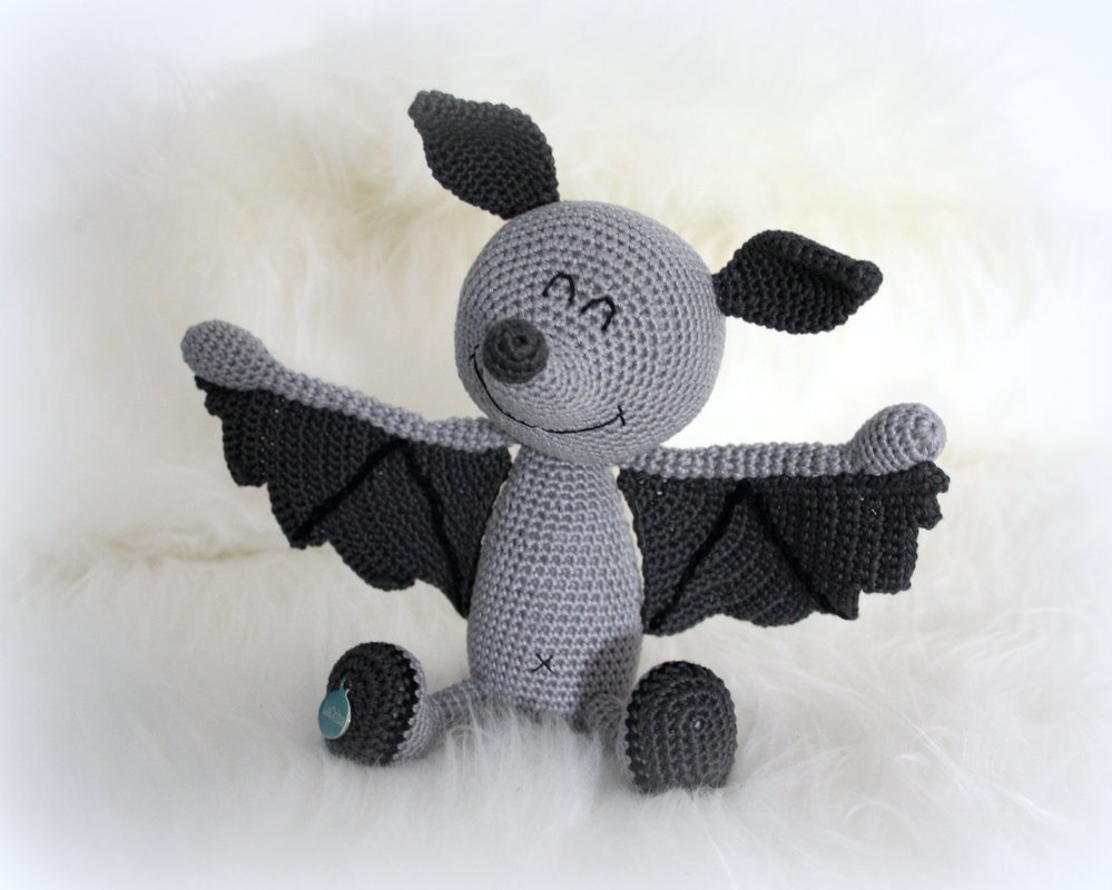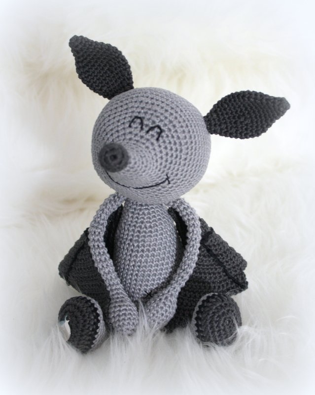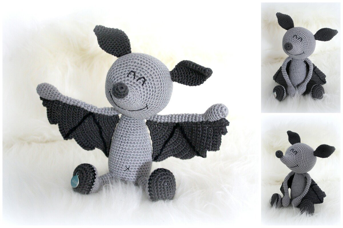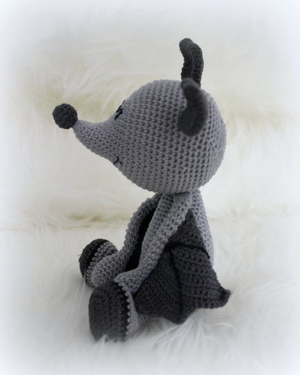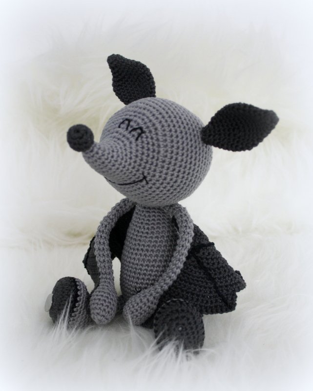 Wenn du mit Baumwolle (125m LL auf 50g) häkelst, wird dein Grinsefledermaus ca. 22cm hoch.