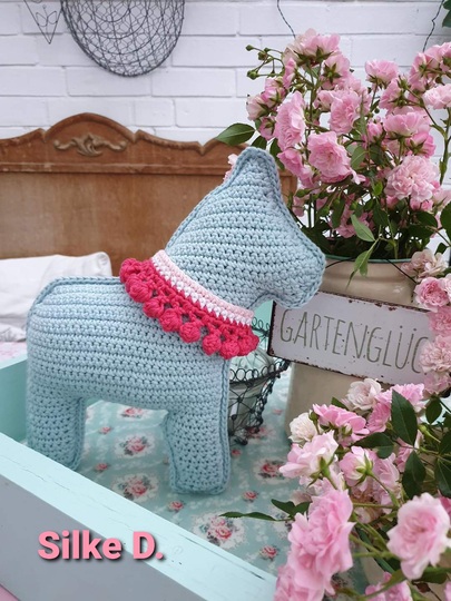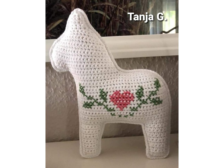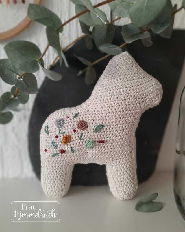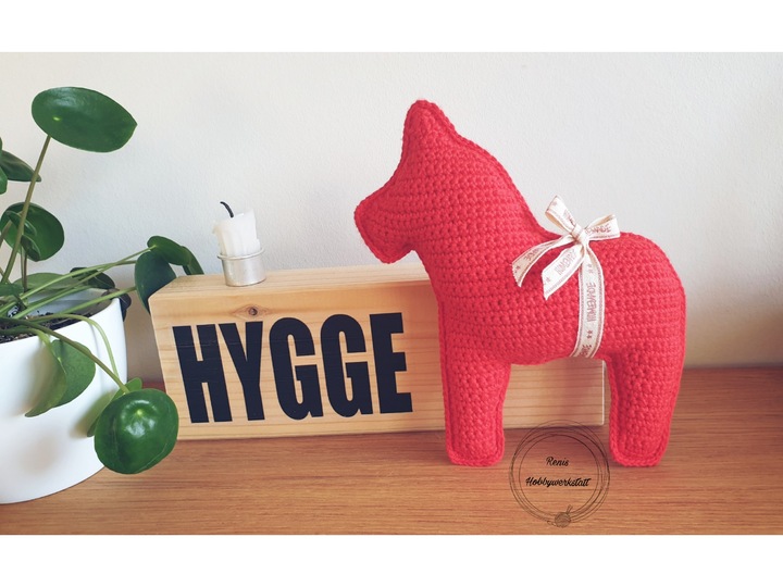 Mit dieser Anleitung kannst du dir dieses tolle Pferd als Applikation, Anhänger oder als Deko zum Hinstellen nachhäkeln. Das Pferd im schwedischen Design ist auch bei Erwachsenen sehr beliebt und ein echter Hingucker. Um für große Augen zu sorgen, kannst Du auch noch eine Mähne und einen Schweif anknüpfen.