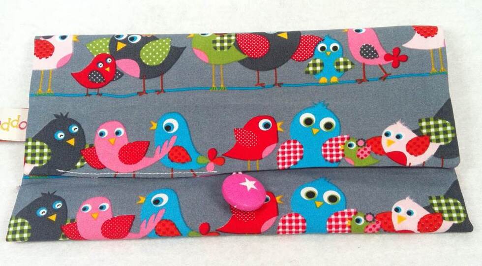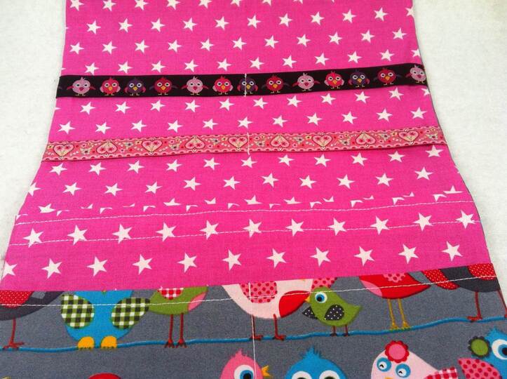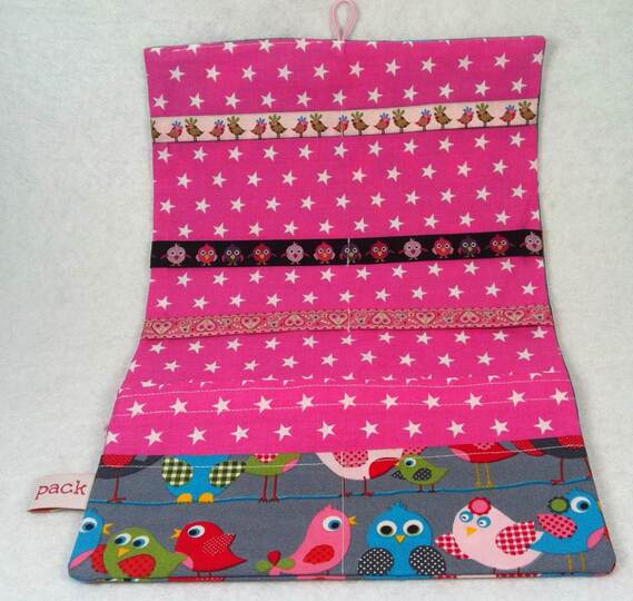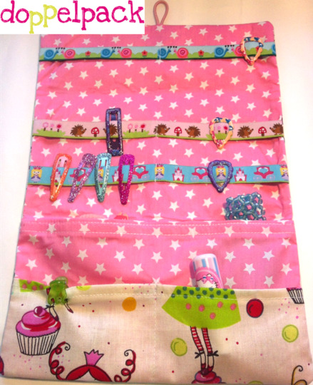 In dieser praktischen Tasche können viele Haarspangen, Haargummis und weitere schöne Kleinigkeiten übersichtlich verstaut werden. Endlich liegen nicht mehr überall Haarspangen und Haargummis herum und wenn welche benötigt werden, sind sie schnell auffindbar! Die Tasche kann zusammengefaltet und verschlossen werden und z.B. in den Urlaub oder zu Oma und Opa mitgenommen werden. Die Tasche wird so genäht, dass an drei Bändern Haarspangen befestigt werden können. Eine große Innentasche mit Klettverschluß und zwei kleinere Innentaschen können für Haargummis etc. verwendet werden.