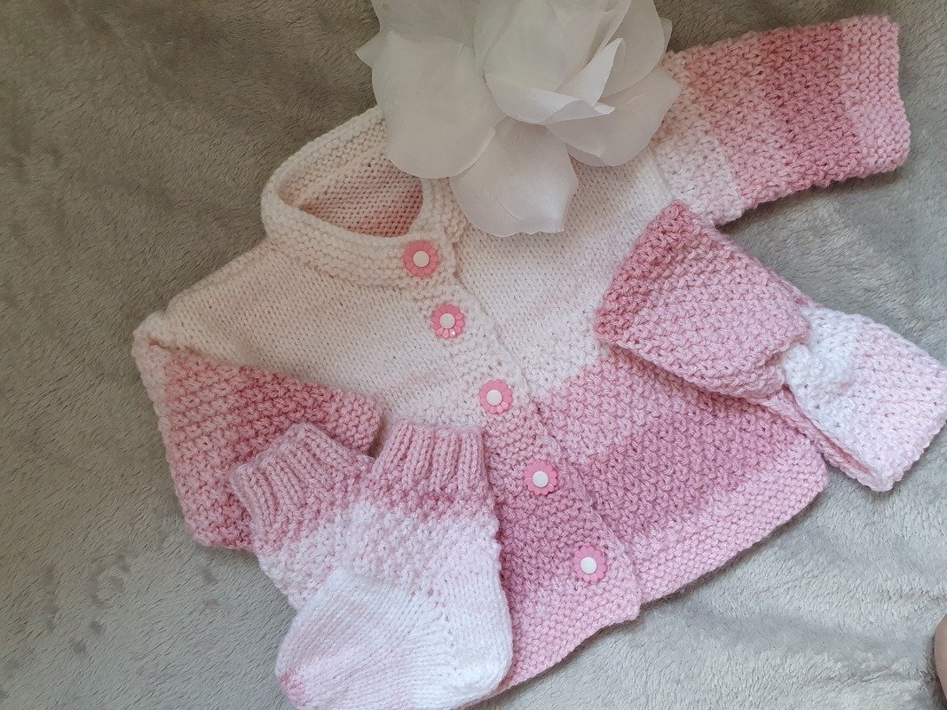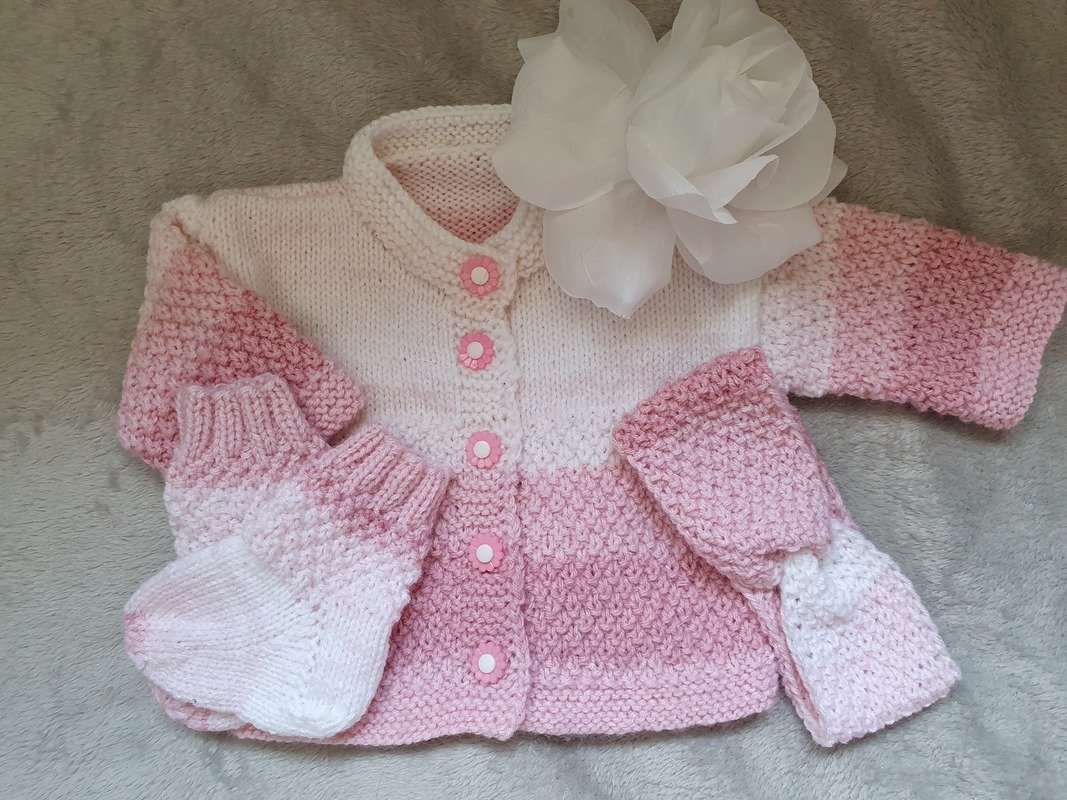 Strickanleitung für ein wunderschöne 3-teilige Babygarnitur in der Größe 56/62 in Rosatönen.