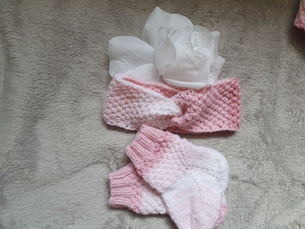 Das gestrickte Set besteht aus Jäckchen, Stirnband und Söckchen und ist das perfekte Mitbringsel für werdende Mamas auf der Babyparty oder als Geschenk zur Geburt.