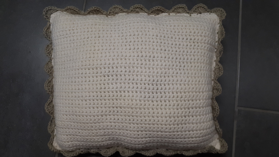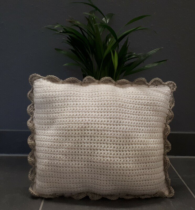 Am besten benutzt du für das Kissen Acrylwolle oder Baumwollgarn. Bitte vergess nicht die Füllwatte, sonst hast du ein plattes Kissen.