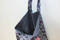Den Stoffbeutel aus dieser Anleitung habe ich mit drei unterschiedlichen Stoffen aus jeweils 100 % Baumwolle genäht. Er hat die Maße 35 x 40 cm und eine Henkellänge von ca. 50 cm, kann also auch bequem über die Schulter getragen werden. Durch den eingenähten Innenbeutel ist die Stofftasche sehr stabil und deswegen auch perfekt für Einkäufe geeignet.