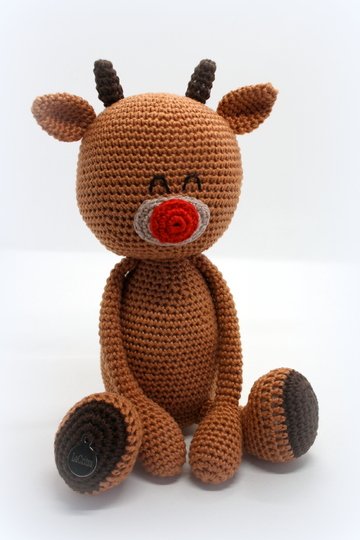Wenn du mit Baumwolle (125m LL auf 50g) häkelst, wird dein Grinserentier ca. 17cm hoch.