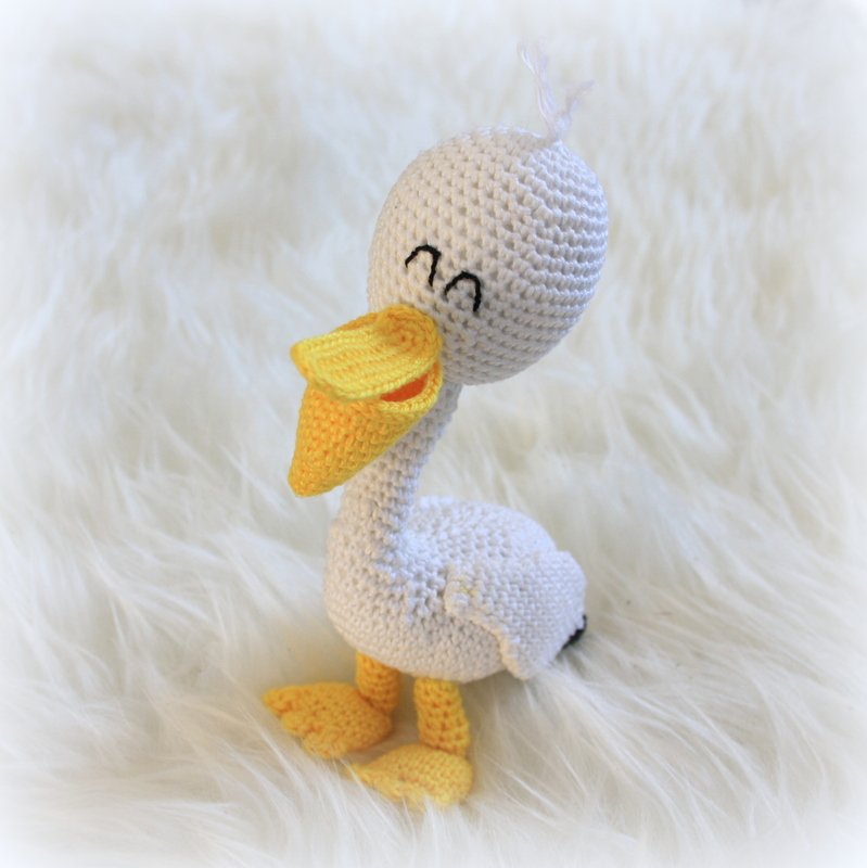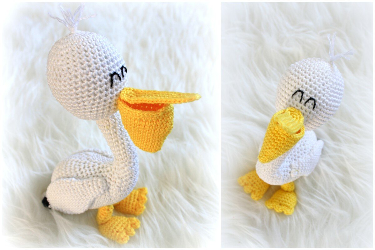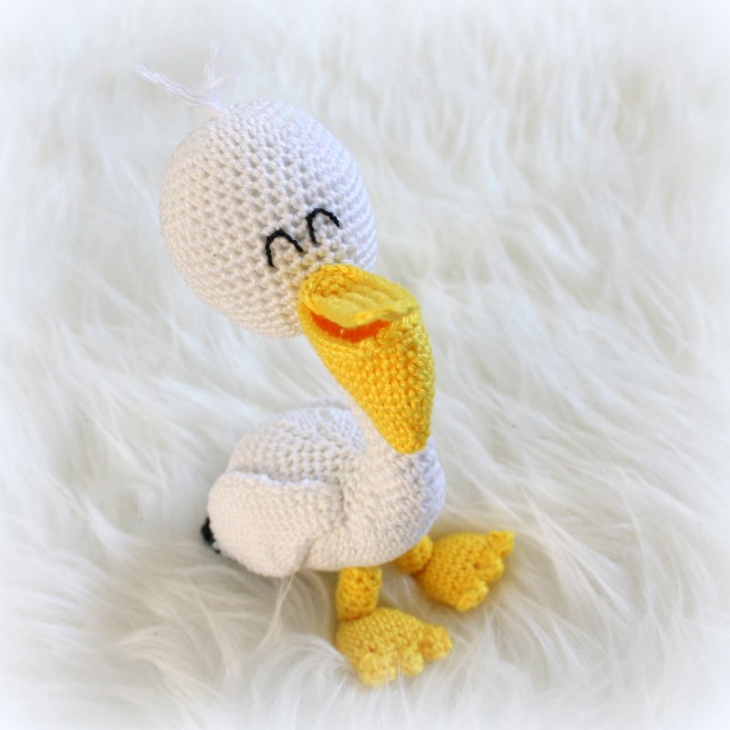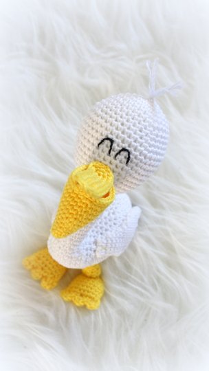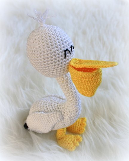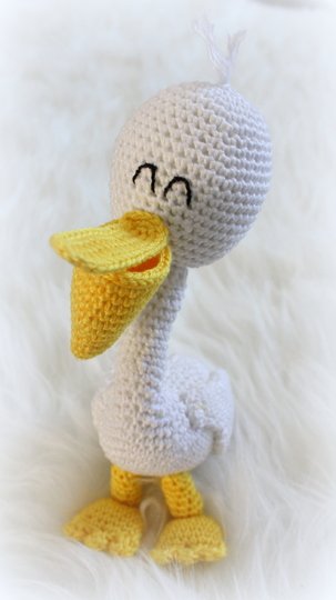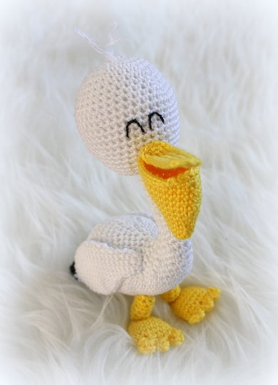 Wenn du mit Baumwolle (125m LL auf 50g) häkelst, wird dein Grinsepelikan ca. 17cm hoch.