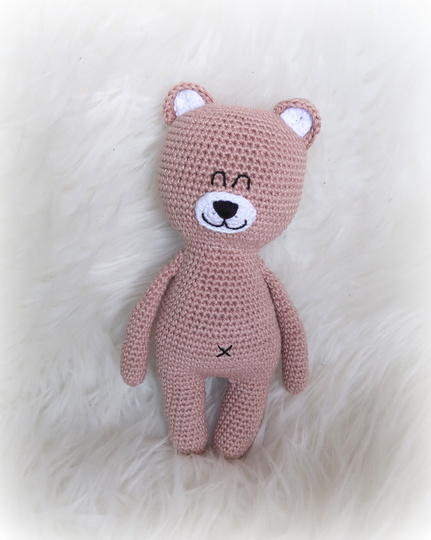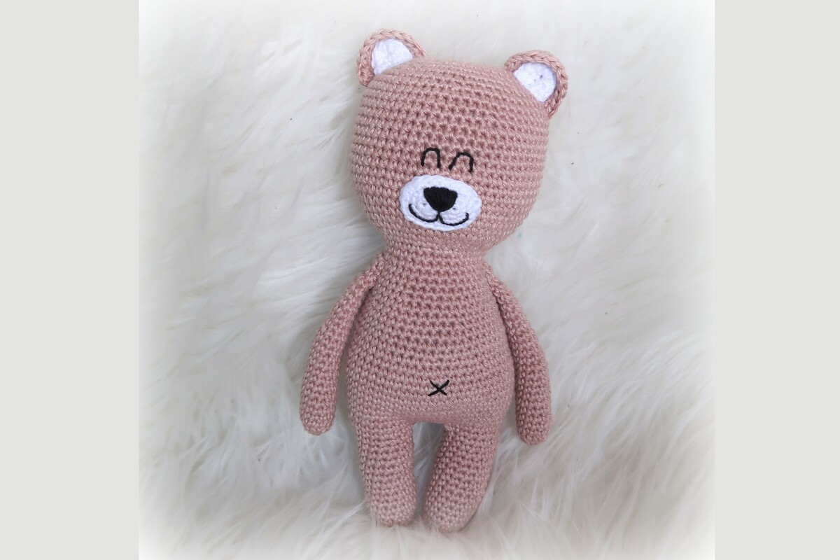 Wenn du mit Baumwolle (125m LL auf 50g) häkelst, wird dein Grinsebär ca. 20cm hoch.