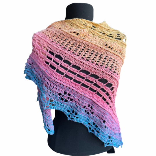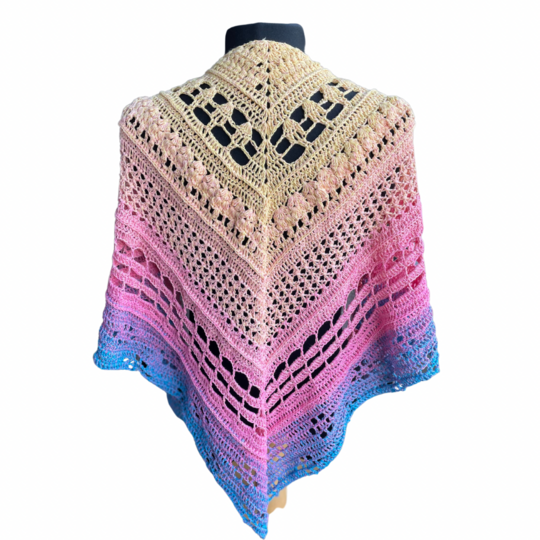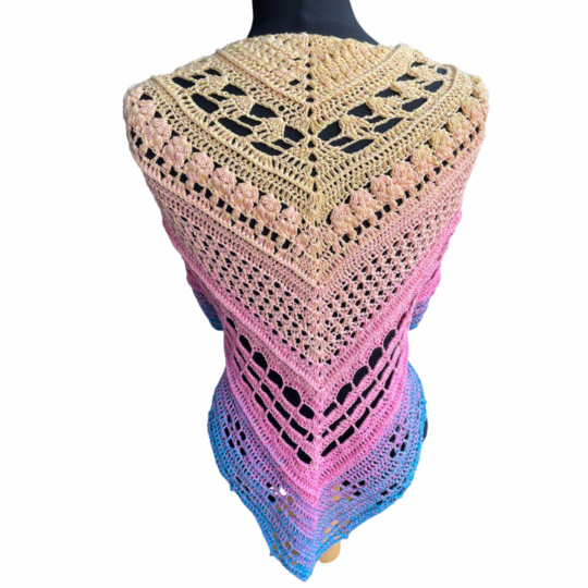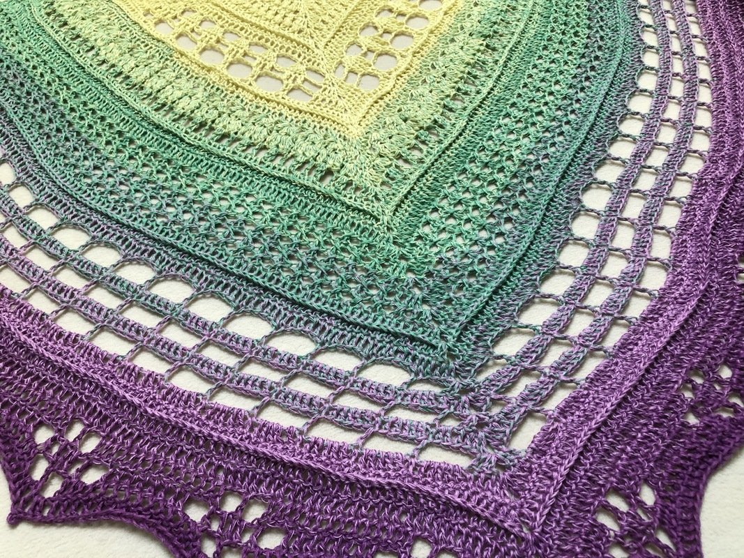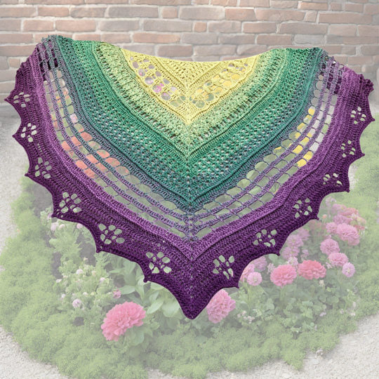 Dieses Dreieckstuch besteht aus 6 Mustern, von denen jedes einzelne eine Hommage an den liebevoll gehegten und gepflegten Garten meiner Mama darstellt.