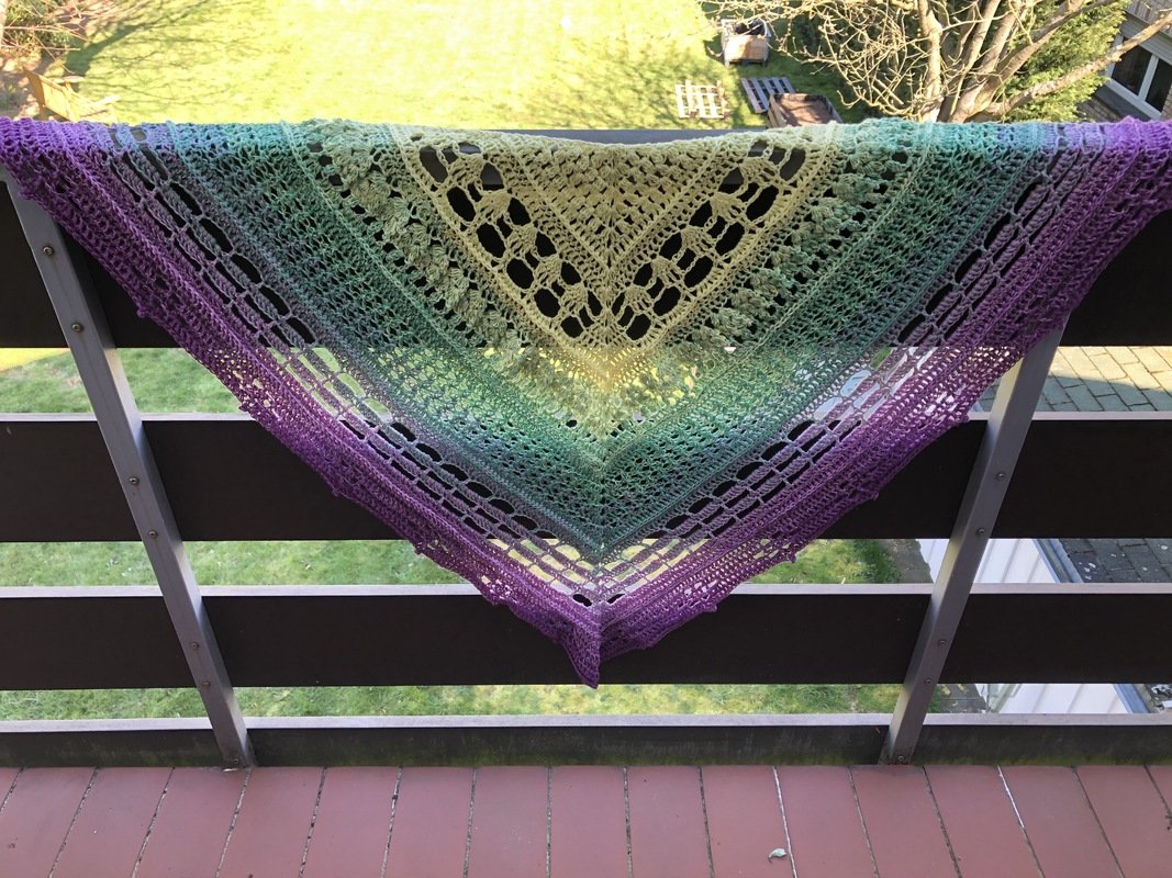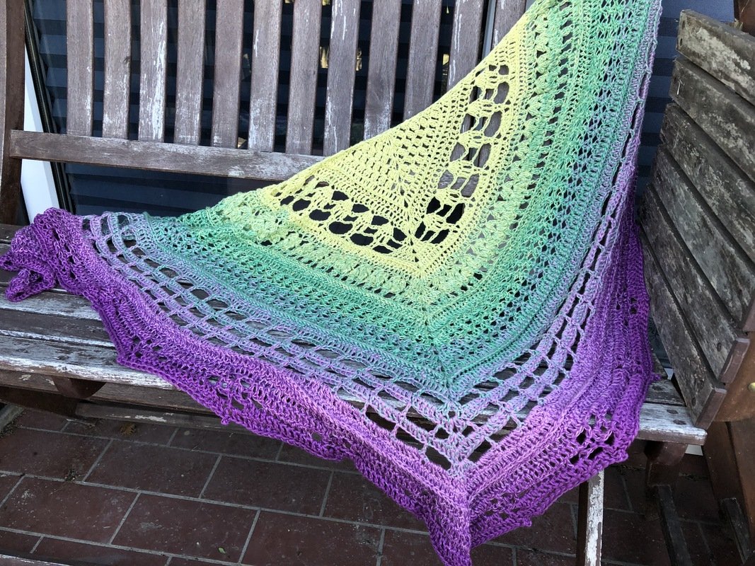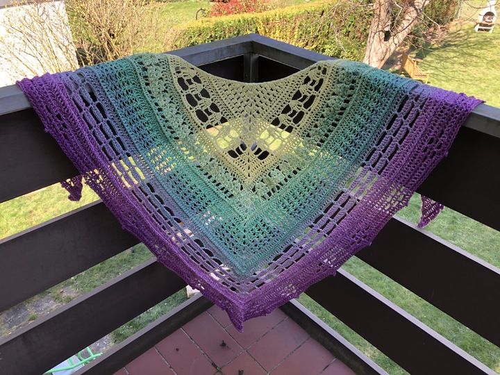 Mein Beispieltuch wurde mit 750m/ 4fädig und NS 4,5 gehäkelt und hat eine Spannweite von 1,40m und eine Tiefe von 0,76m erreicht.