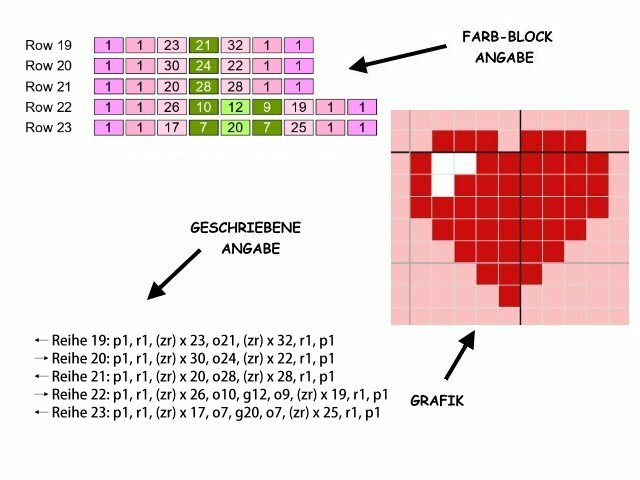 -farbige Zahlen-Blöcke für jede Reihe für feste Maschen (Stb od. hStb)