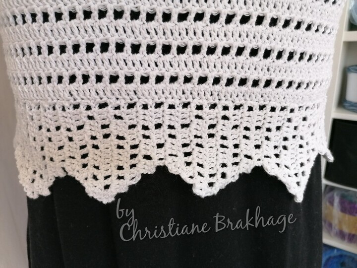 Es ist als RVO in einen einfachen Muster mit einer Filet-Borte als Abschluss gearbeitet. Kleine Ärmel runden das Bild ab.