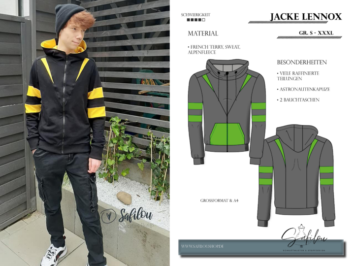 Mit dem Schnittmuster „Lennox“ kannst du eine vielseitige und moderne Herrenjacke in den Größen S bis 3XL kreieren. Der clevere Schnitt mit zahlreichen Teilungen ermöglicht es dir, spannende Stoffkombinationen auszuprobieren und der Jacke eine individuelle Note zu verleihen. Besonders hervorzuheben ist die Astronautenkapuze, die der Jacke nicht nur einen coolen Look verleiht, sondern auch für zusätzlichen Komfort sorgt. Die praktischen Bauchtaschen bieten ausreichend Platz für wichtige Dinge, während der durchgehende Reißverschluss ein unkompliziertes An- und Ausziehen gewährleistet. Egal ob aus French Terry, Sweat oder Alpenfleece – diese Jacke ist ein idealer Begleiter für jede Jahreszeit!Besondere Highlights des Schnittmusters: