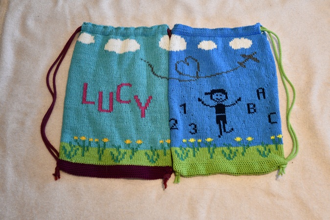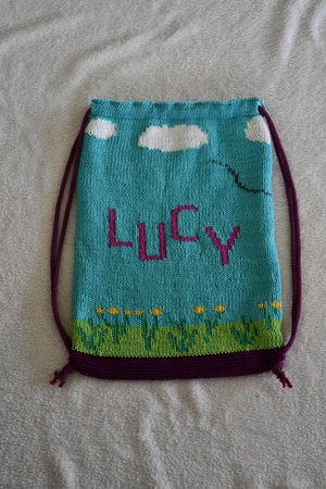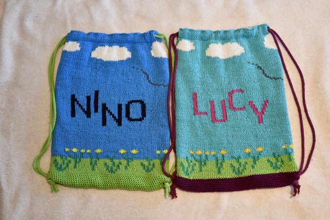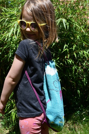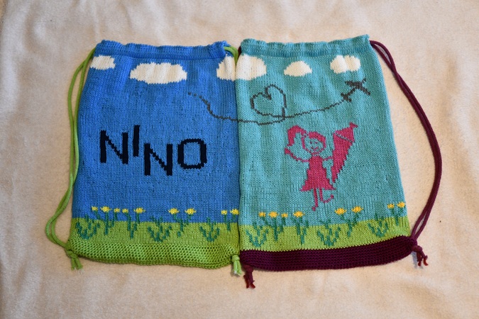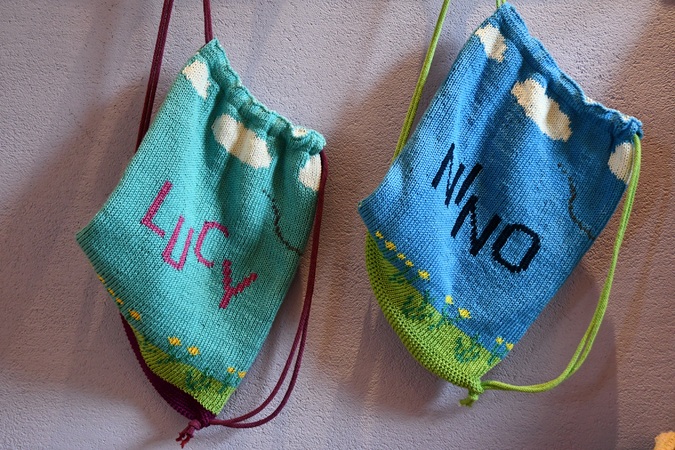 Der Turnbeutel wird in Doubleface gestrickt. Dabei werden in gewissen Abschnitten die Farben gewechselt, so dass sich ein wunderbar kindgerecht buntes Strickbild ergibt. Der Boden wird mit festen Maschen in Runden gehäkelt.