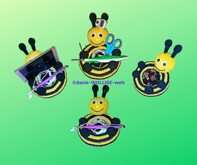 Diese Biene ist zudem noch sehr hilfsbereit, sie bewahrt gerne deine Nähuntensilien auf oder stützt dein Smartphone zum Video schauen.