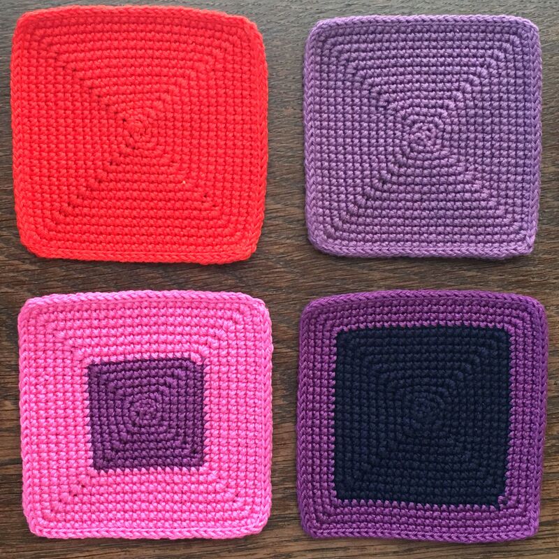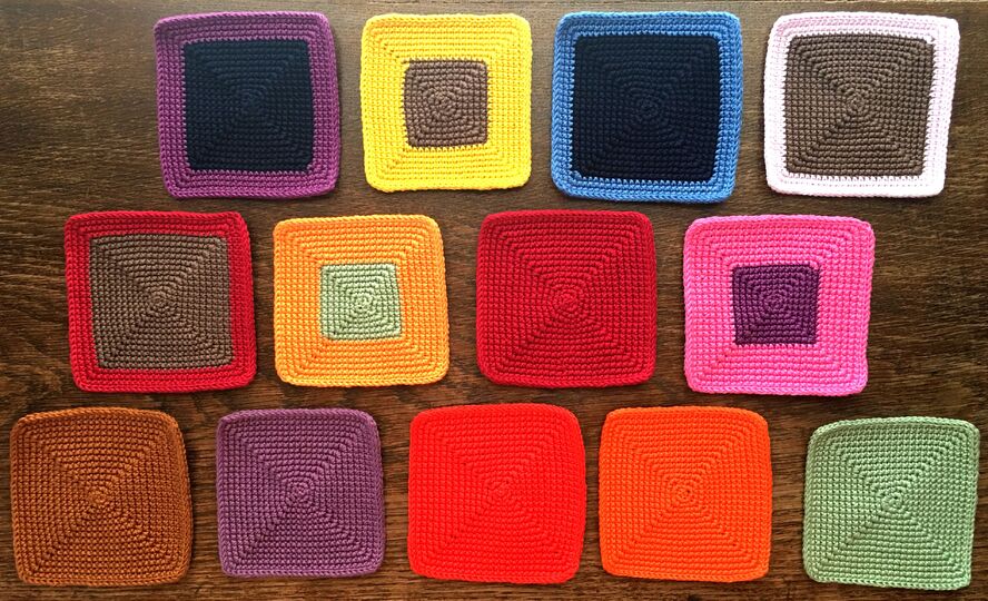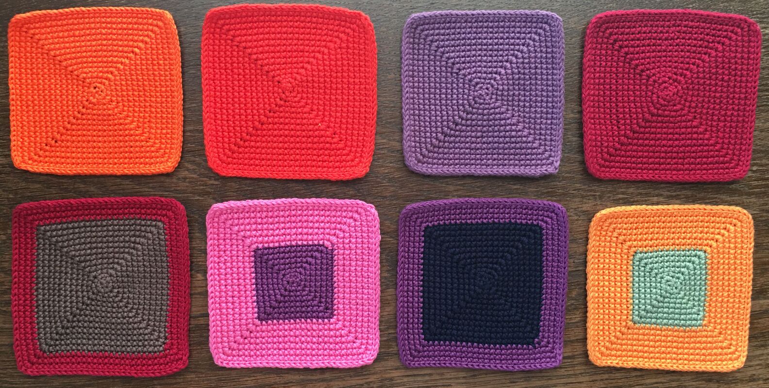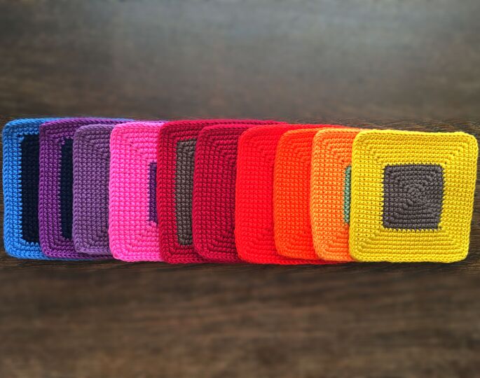 Es macht Spaß, besondere Farbkollektionen zu erfinden: als Erinnerung an einen besonders schönen Urlaub, passend zur aktuellen Jahreszeit, mit Regenbogenfarben oder einfach aus Wollresten. Auf den Fotos ist z.B. eine Herbst-Serie zu sehen: mit "Sonnenblume" (innen braun, außen gelb) über "Kürbis" bis zu "Blaubeere". Du kannst aber auch Landschaftsfarben (Provence) nehmen, liebste Urlaubsziele (Lanzarote), Farben des Lieblingsclubs, Flaggen-Farben, Winter, Cocktails oder Minecraft-Materialien. Die „Bierdeckel“ können cool sein oder eher verspielt, ganz nach Lust und Laune.