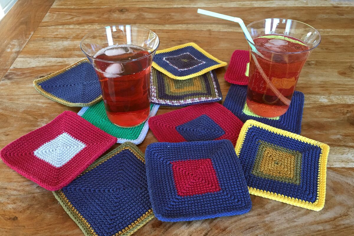 Die bunten Untersetzer sind für Anfänger gut geeignet. In der bebilderten PDF-Anleitung wird erklärt, wie die kleinen Kreuzmaschen funktionieren, wie du fast unsichtbare Farbwechsel und den modernen Rand hinbekommst.