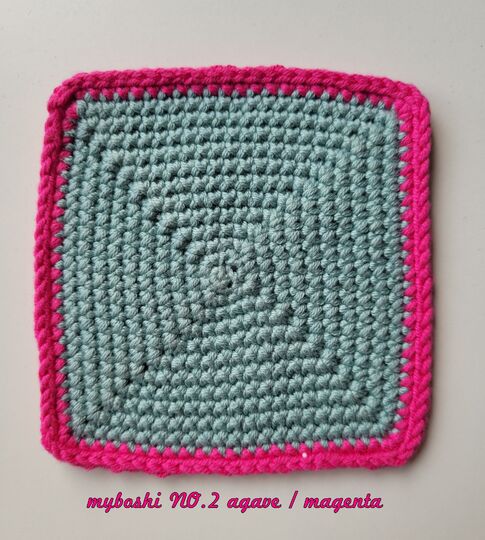 Die Untersetzer klappen auch mit etwas dickeren Baumwollgarnen. Mit myboshi No.2 (Lauflänge 100 m) und Häkelnadel Nr. 2,5 werden die Quadrate etwas dicker. Man ist auch 1-2 Runden eher fertig. Auf den Fotos ist der zartgrüne Untersetzer mit dem pinkfarbenen Rand mit myboshi gehäkelt.