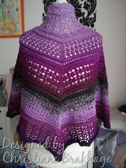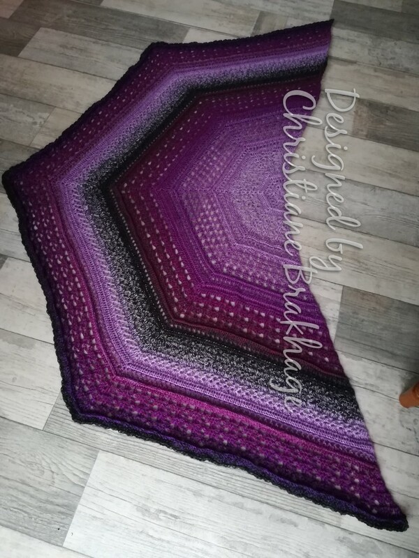 Das lila Tuch aus 4-fädigem Farbverlaufsgarn (50% Baumwolle / 50% Polyacryl) hat bei einer LL von 1200 m eine Breite von 1,60 m und eine Tiefe von ca. 0,68 m