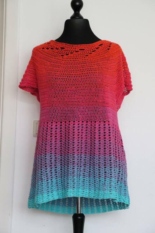 Die Anleitung richtet sich an die Grössen XS bis XL, aber es gibt auf der letzten Seite eine kleine Erklärung wie man es noch etwas weiter häkeln kann, was dann ca einer Kleidergrösse XXL entsprechen würde.