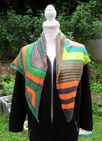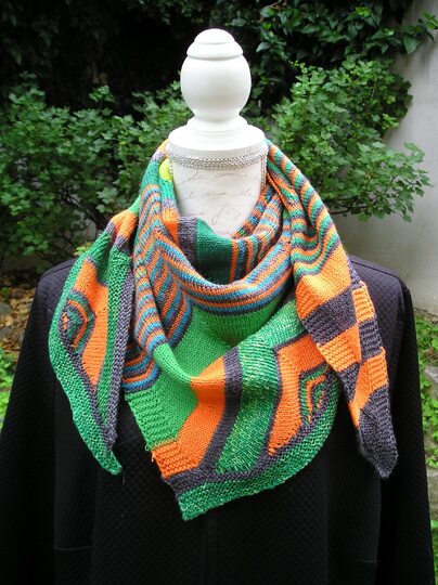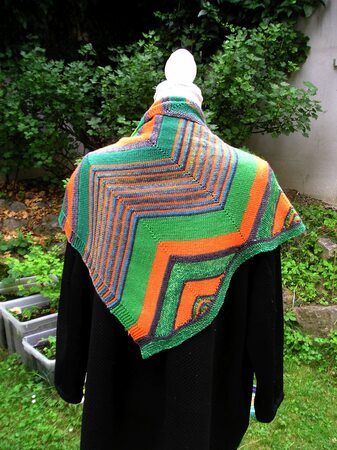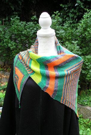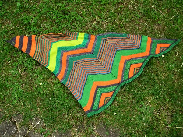 Das Tuch wird mit dünnen Nadeln aus lauter bunten Resten von 4-fädiger Sockenwolle gestrickt. Es ist ein asymmetrisches Tuch. Das heißt, es werden nur auf einer Tuchseite Maschen zugenommen. Man beginnt an einem Zipfel damit, Streifen zu stricken. Wenn man genügend Maschen für eine Zick-Zack-Seite auf der Nadel hat, nimmt man Maschen für die zweite Zick-Zack-Seite zu. Fortan werden in einer Ecke Maschen zusammengestrickt und in der nächsten Ecke Maschen herausgestrickt, solange bis man wider genügend Maschen auf der Nadel hat, um die nächste Zick-Zack-Seite zu beginnen. Hat man die Tuchgröße erreicht, müssen die Vertiefungen im Zick-Zack-Muster noch mit verkürzten Reihen aufgefüllt werden. Für größere Tücher kann man einfach ein paar Zick-Zack-Seiten mehr stricken als hier angegeben.