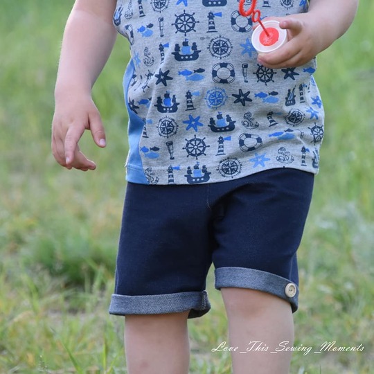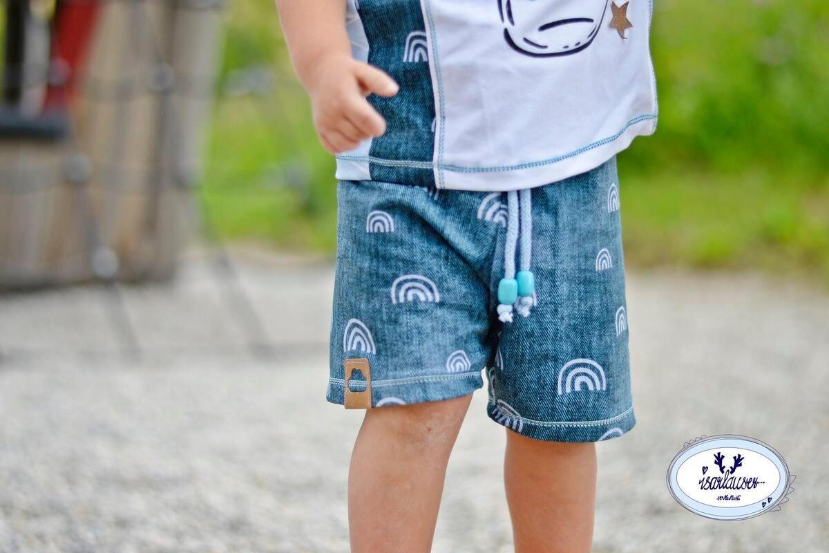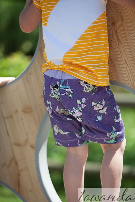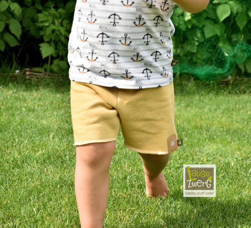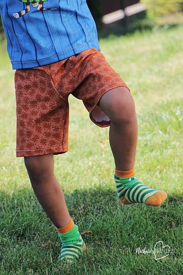 Finn ist eine schnell genähte Bermuda. Sie besteht lediglich aus zwei Zuschnittteilen plus Bündchen. Dadurch gibt es keine Außennaht am Bein, was für einen bequemen Sitz sorgt. Ausgelegt ist die Hose auf Sweat.