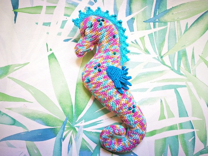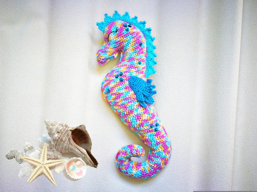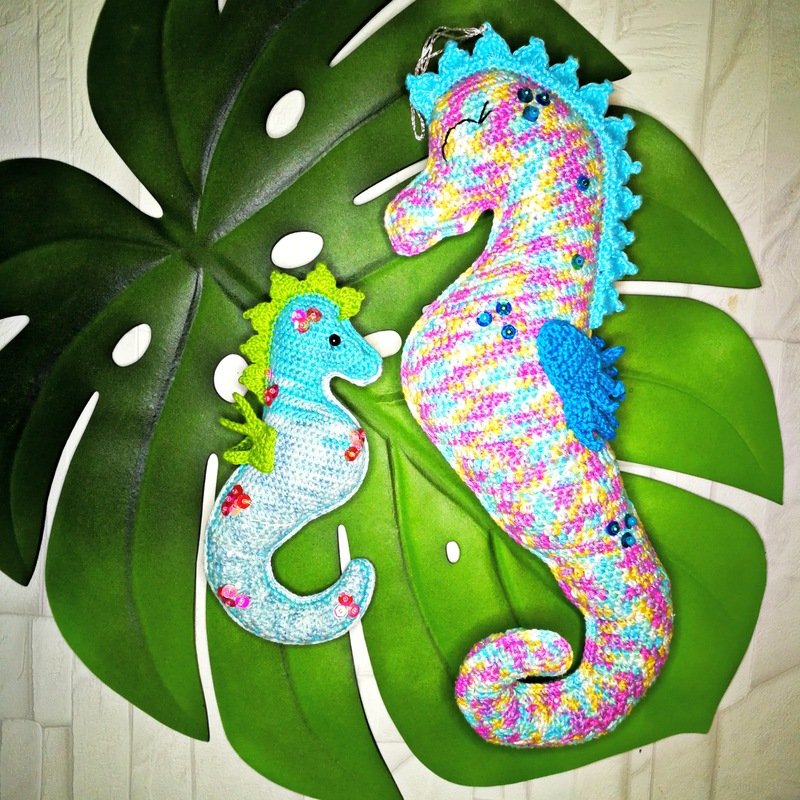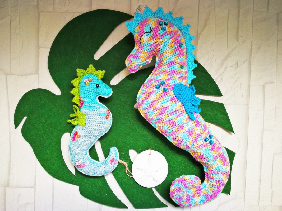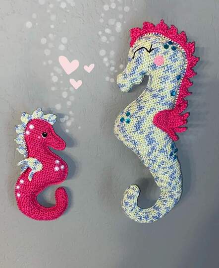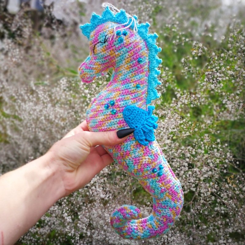 • Mit angegebenem Garn wird das große Seepferdchen ca. 32 cm hoch.