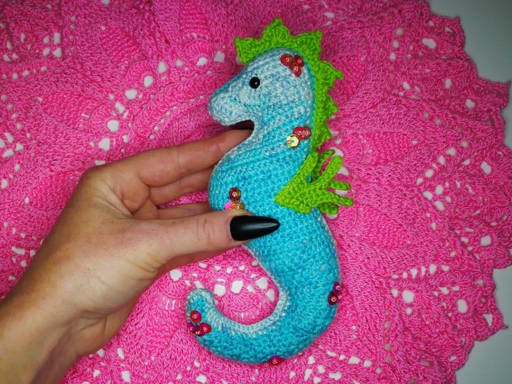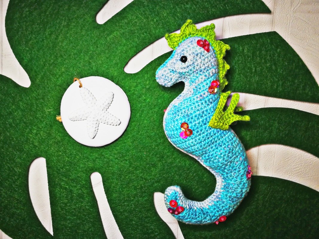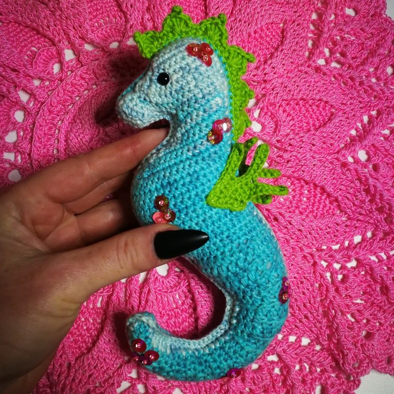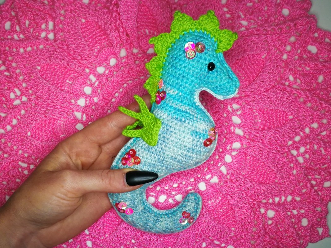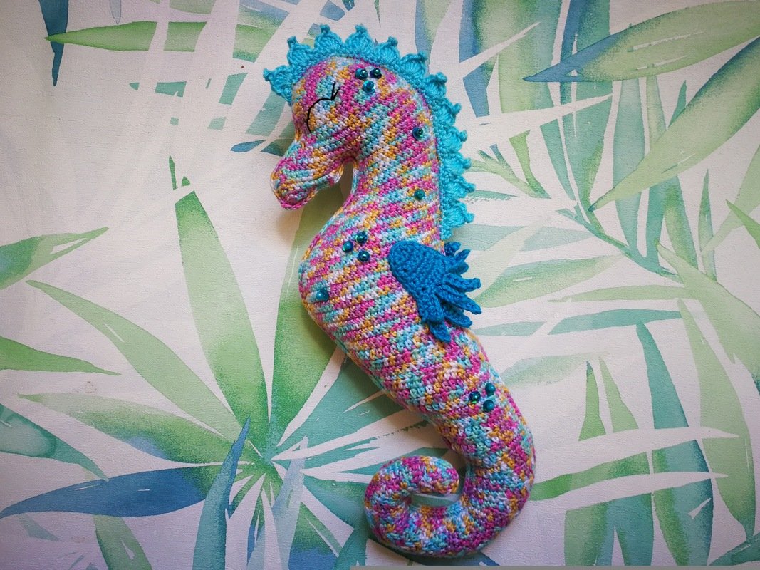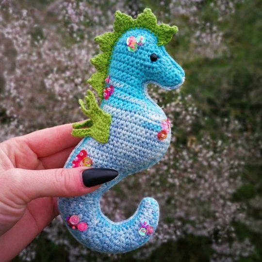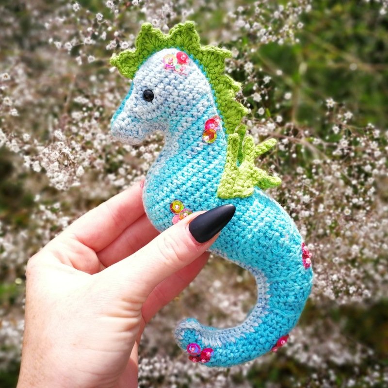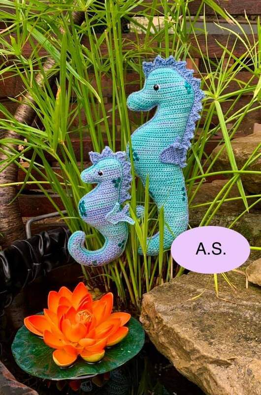 • Mit angegebenem Garn wird das kleine Seepferdchen ca. 16 cm hoch.