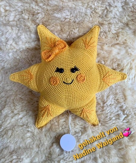 Die Schmuse-Sonne wurde mit Baumwollgarn (50g-125m) und einer 2,5 Nadel gehäkelt.