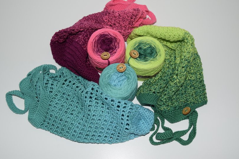 Ich arbeite hier für jede der 3 Taschen mit einem Minibobbel mit 300m (75g) in 2 Farbwechsel. Mit diesem kleinen Bobbel kannst du je eine Tasche häkeln. Der Farbverlauf hilft dir, auch ohne Anleitung mehrere Taschen gleicher Größe zu häkeln, denn jeder der drei Farbabschnitte ist ein Häkelabschnitt. Ich habe mir, für jede der 3 Farben, ein anderes Muster ausgedacht, so kannst du dir eins aussuchen und hast immer etwas Abwechselung beim Häkeln. Da die 3 Muster in unterschiedlichen Schwierigkeitsgraden sind, ist die Anleitung perfekt für Anfänger und Fortgeschrittene, denn hier ist für jeden etwas dabei.