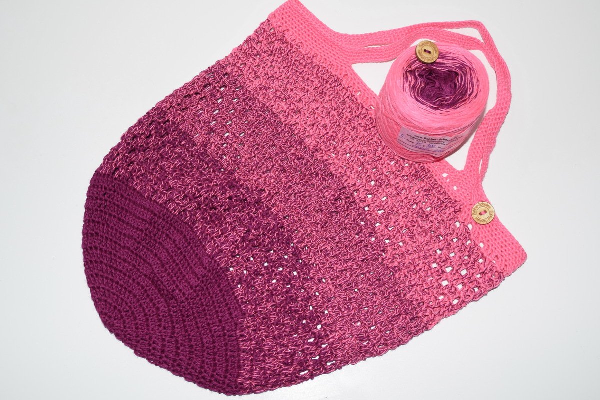 Die Tasche wird mit den angegebenen Garn ca. 26cm im Duchmesser und 30cm hoch.