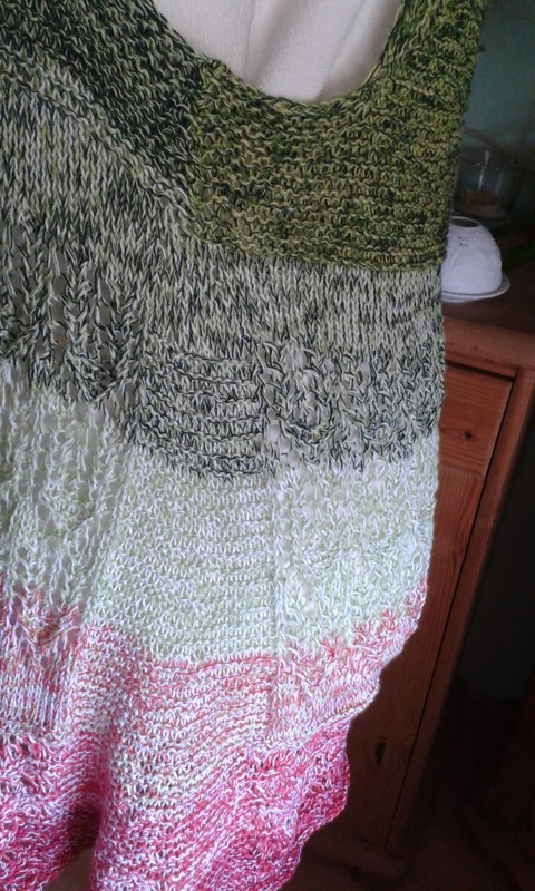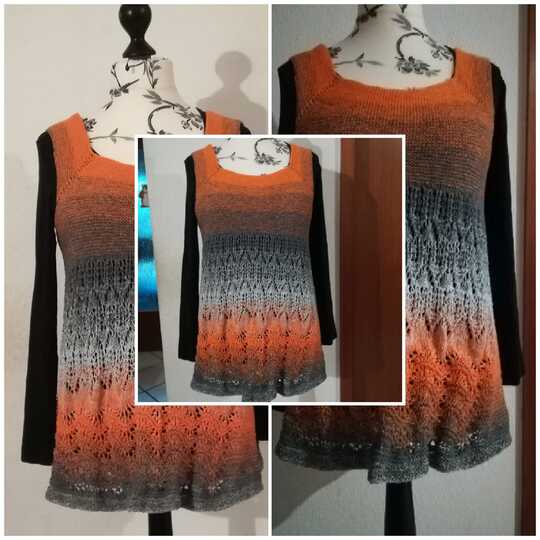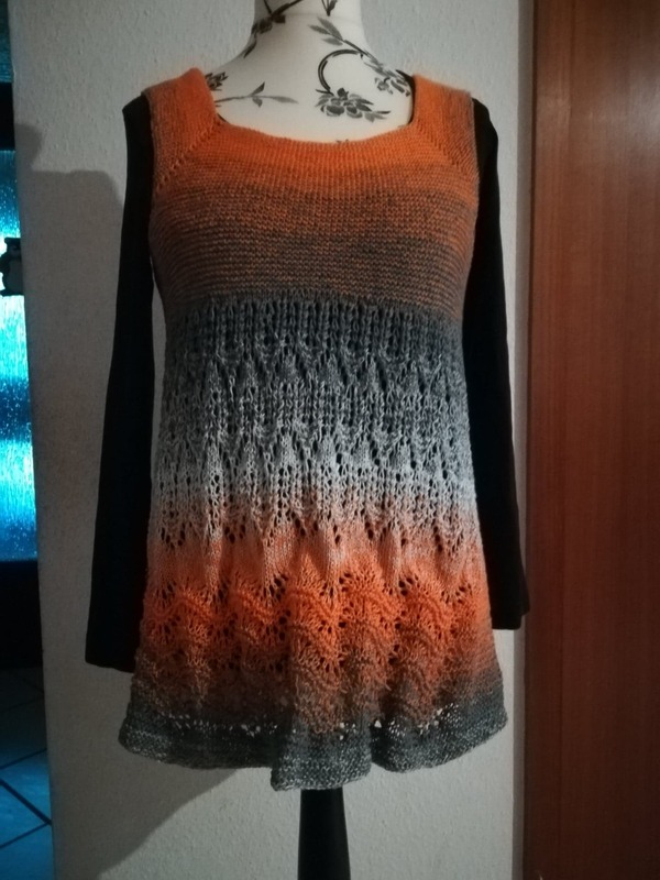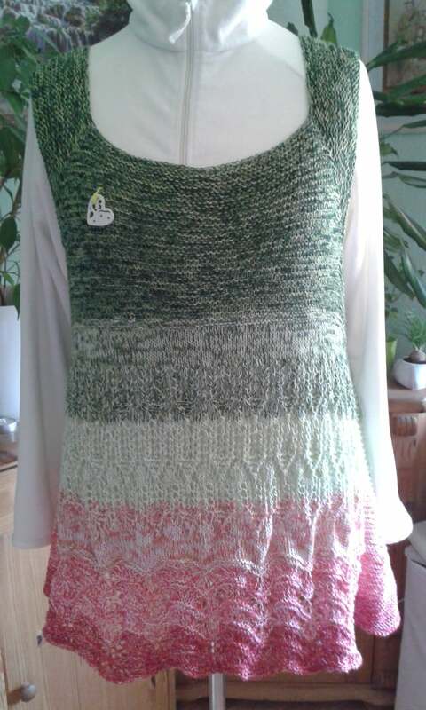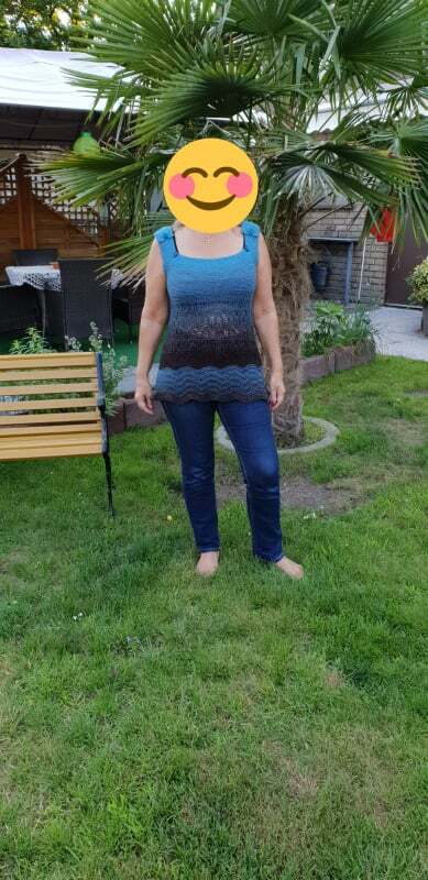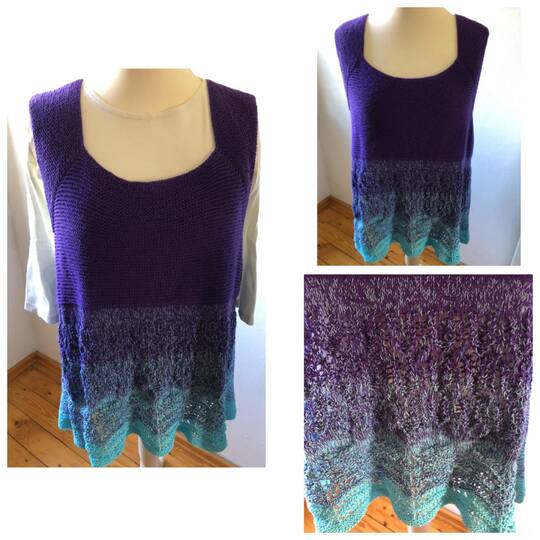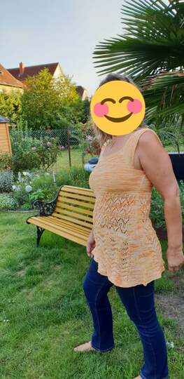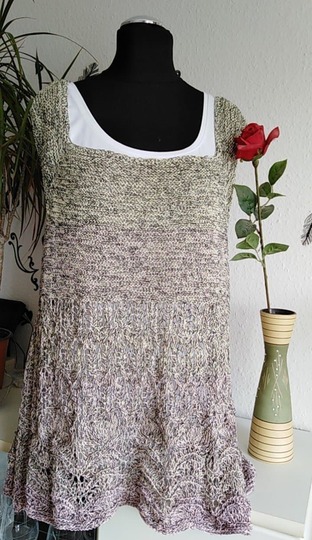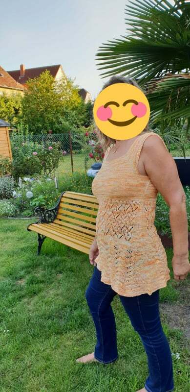 Das Top wird in zwei Teilen begonnen, die dann unterhalb der Achseln zu einem Teil zusammen gefügt werden. Die Zunahmen sind an der Seite und erstellen so eine leicht ausgestellte A-Linie, die nicht nur ein lockeres Oberteil ergeben sondern auch jeder Figur schmeicheln.