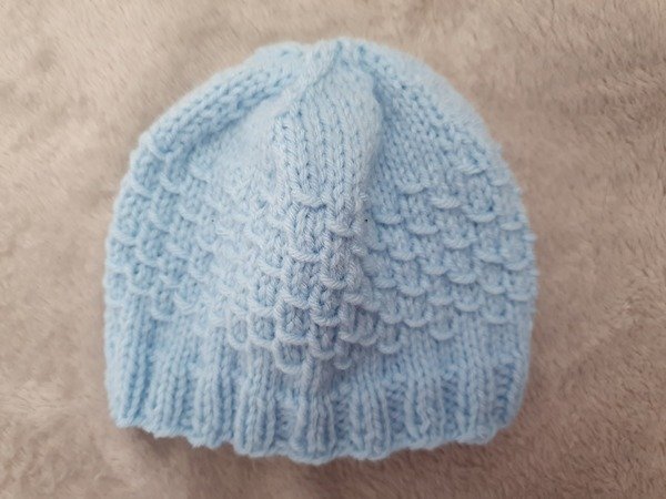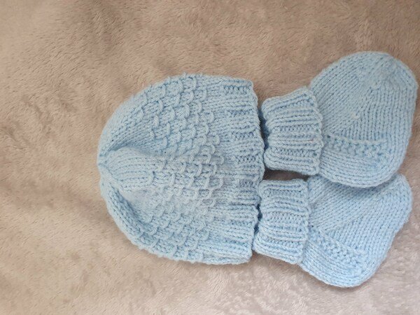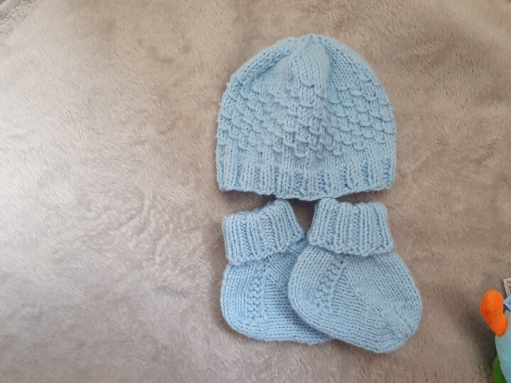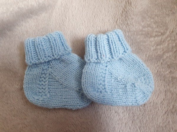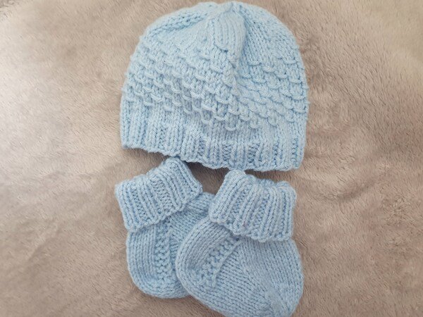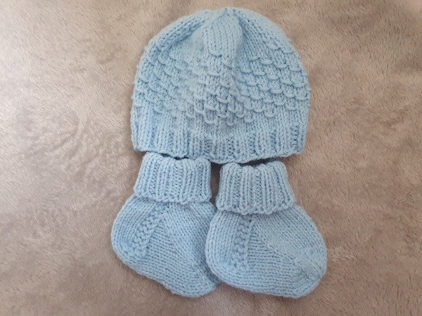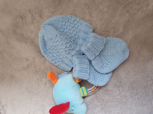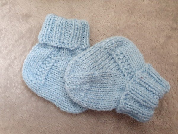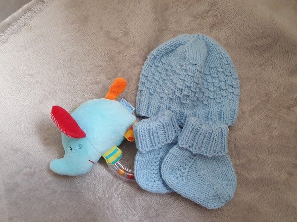 Mütze und Söckchen habe ich mit einem Nadelspiel Stärke 3 gestrickt.