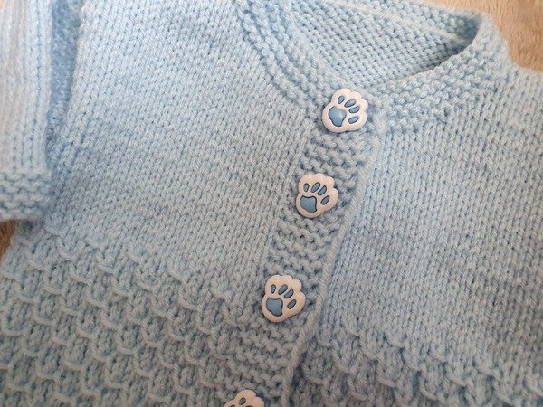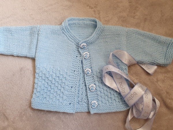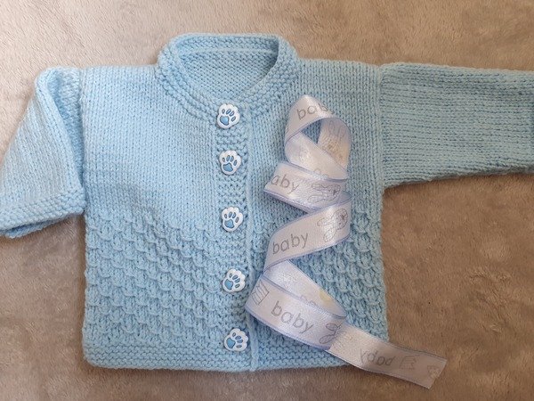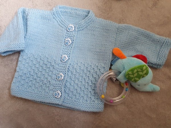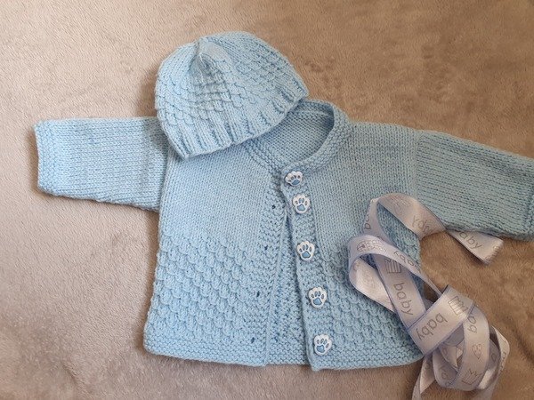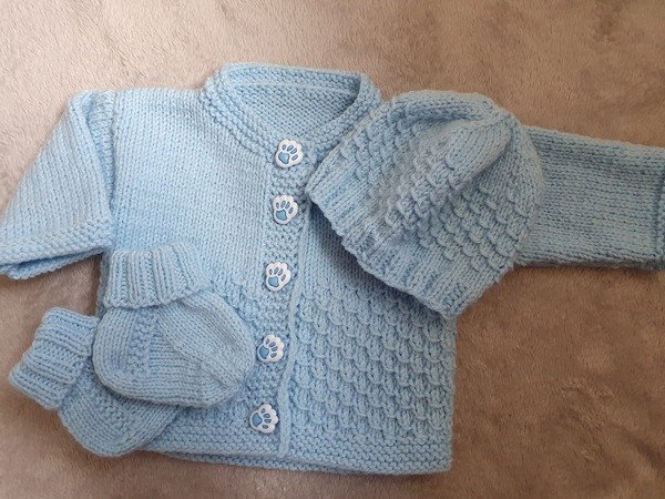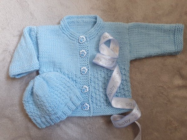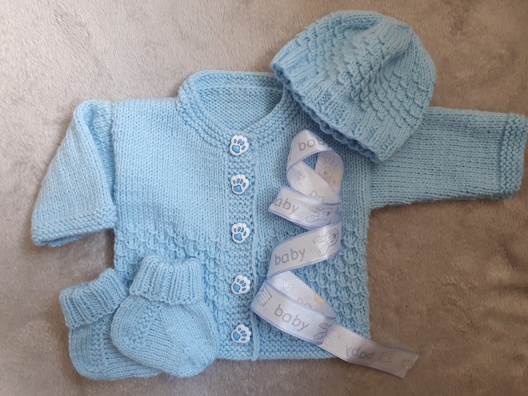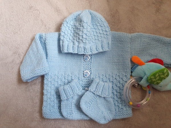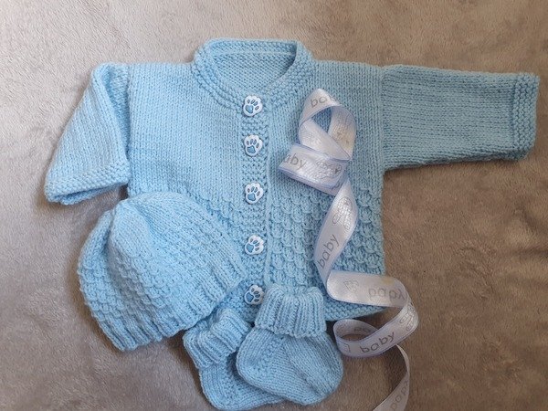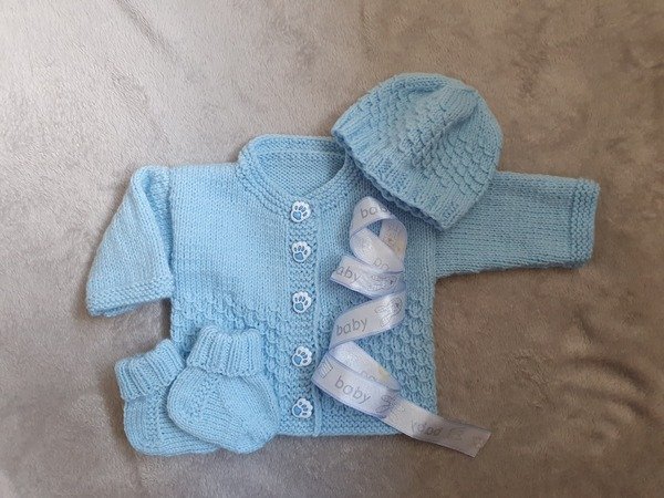Strickanleitung für ein wunderschöne 3-teilige Babygarnitur in der Größe 56/62 in Blau.