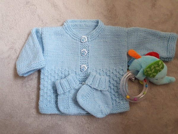 Das gestrickte Set besteht aus Jäckchen, Mütze und Söckchen und ist das perfekte Mitbringsel für werdende Mamas auf der Babyparty oder als Geschenk zur Geburt.