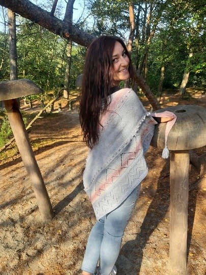 Gestrickt aus einem feinen Merinogarn, ist es sowohl im Sommer als auch im Winter geeignet. Wegen der Größe läßt es sich auch gut als Schultertuch tragen.
