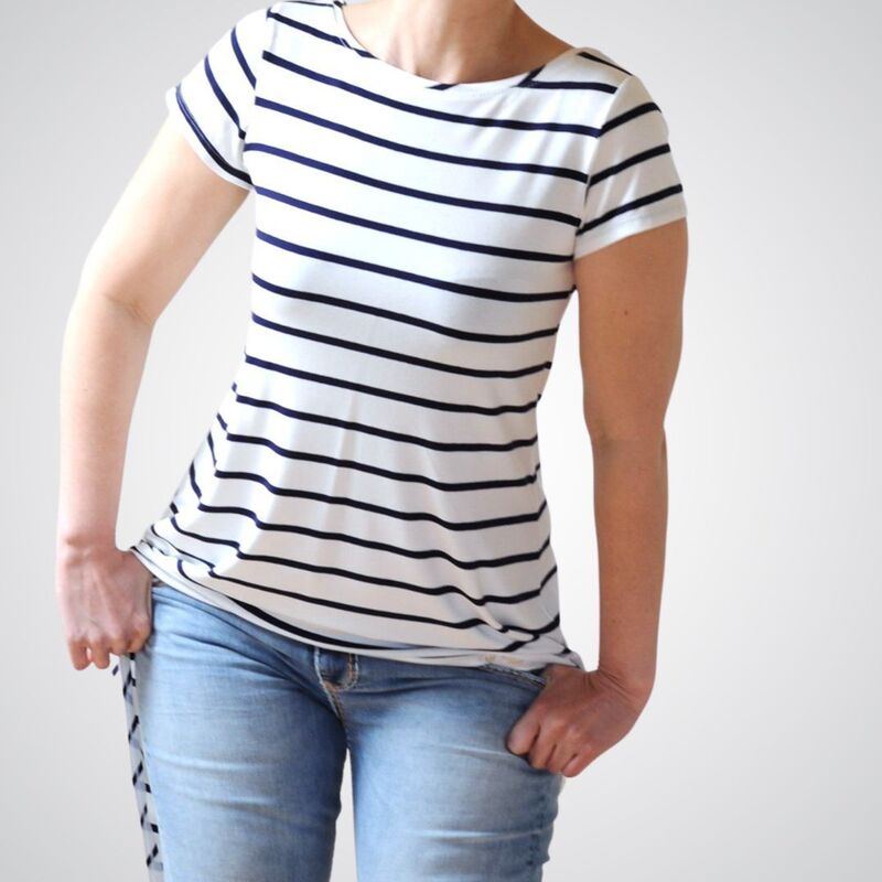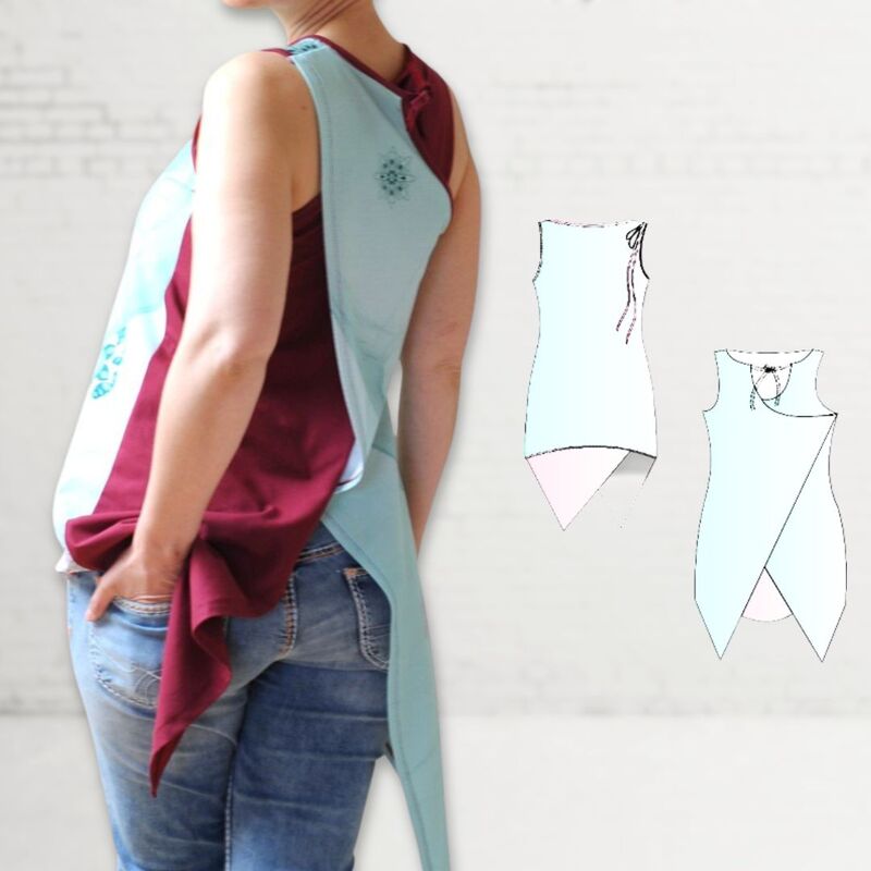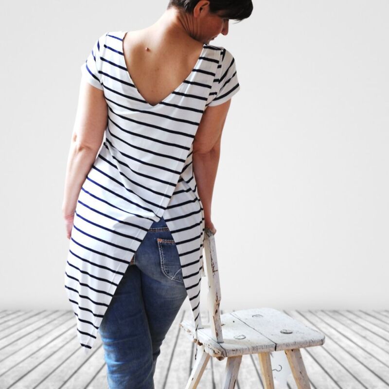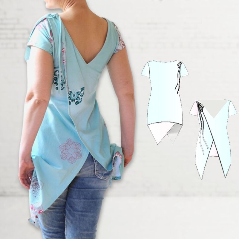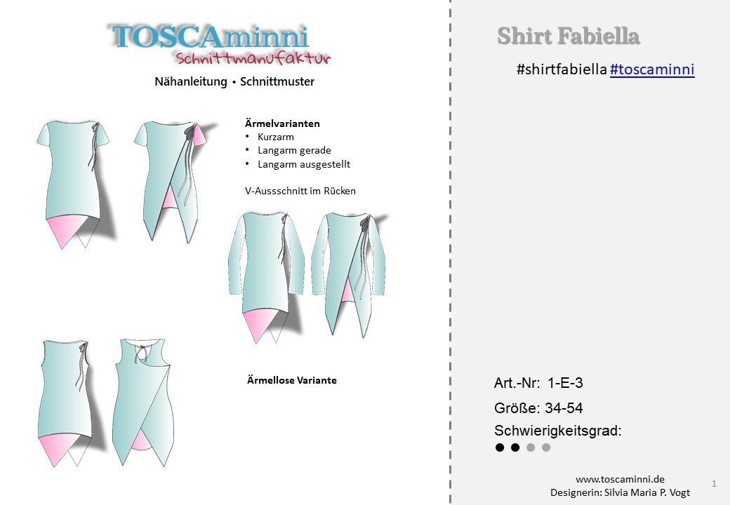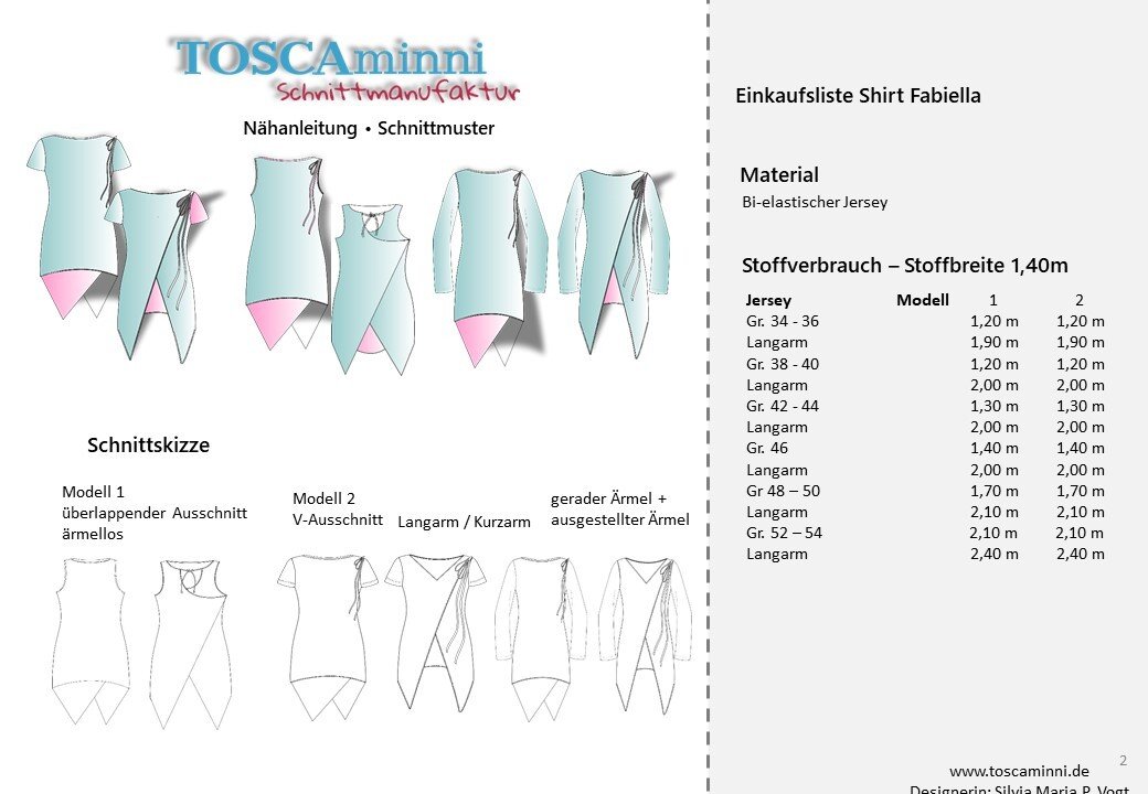 Das Schnittmuster Fabiella ist ein extravagantes Sommershirt in zwei Varianten. Die erste Version hat Ärmel und einen V-Ausschnitt im Rücken. Die andere Version ist ärmellos und einen runden Rückenausschnitt. Die Rückenteile sind überlappend genäht, so dass es wie ein Wickelshirt wirkt. Die Enden sind in Zipfeloptik gehalten - das Shirt ist asymmetrisch geschnitten - also vorne kurz und hinten länger.