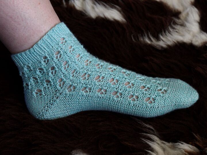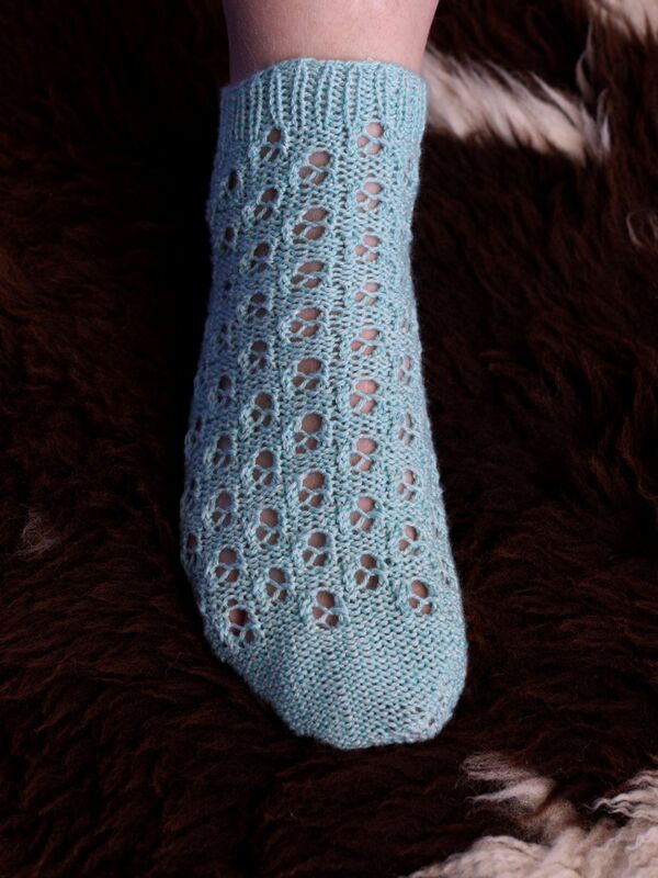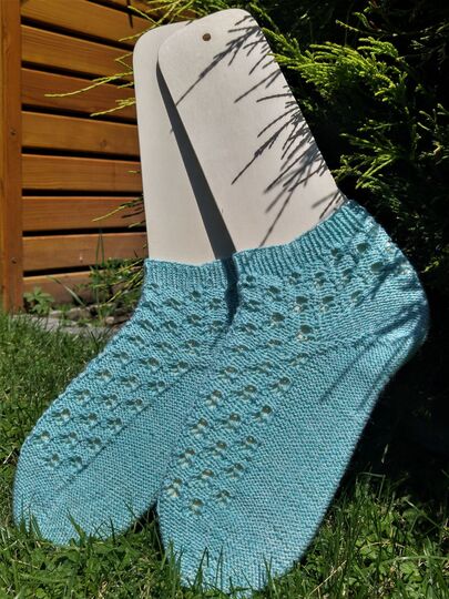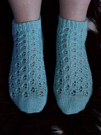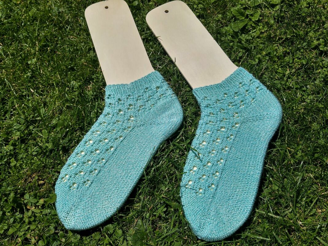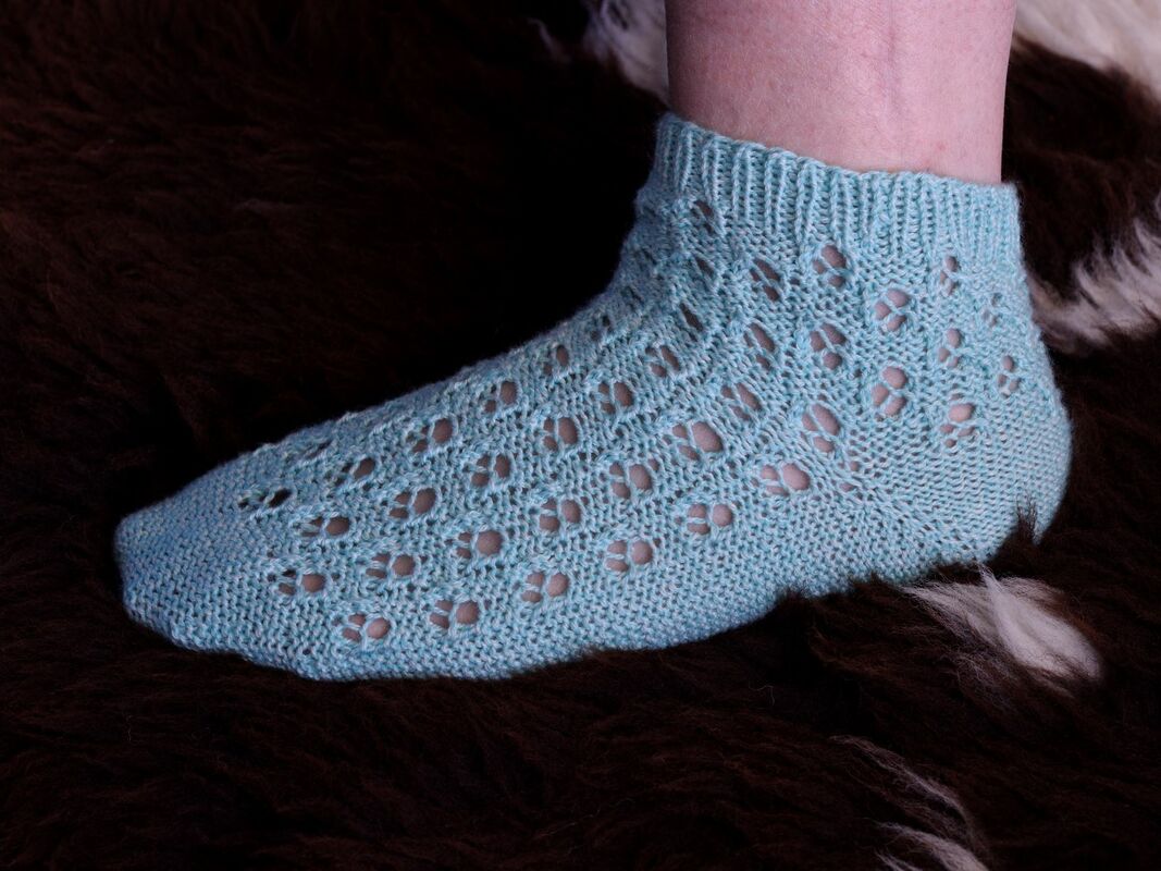 Laue Sommernächte laden nun wieder zum Draußen sitzen ein. Damit zarte Frauenfüße dabei nicht frieren, werden sie von diesen Sneakersocken mit einem luftigen Lochmuster gewärmt. Die Sohle der Socken wird mit linken Maschen gestrickt, damit es besser zum restlichen Muster passt. Daher zeigt die Innenseite rechte Maschen und ist so besonders kuschelig und anschmiegsam. Ein leichtes Baumwollmischgarn in frischem Türkis sorgt dafür, das die Söckchen vor der Abendkühle schützen, aber nicht zu warm sind.