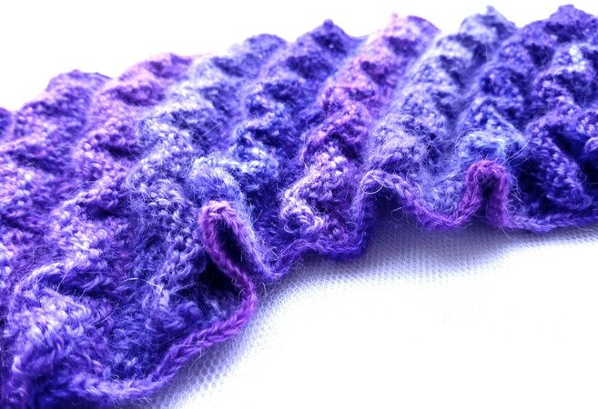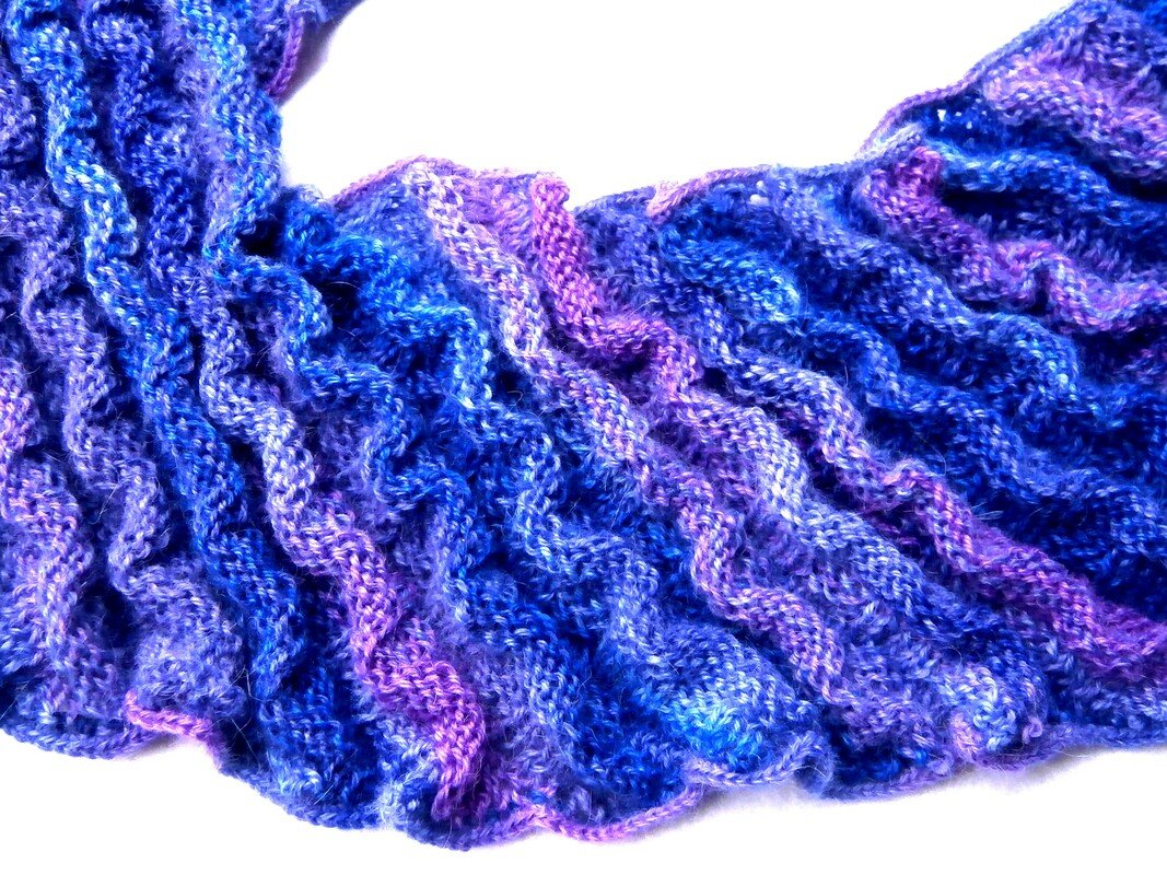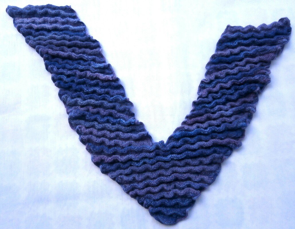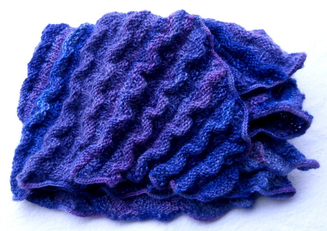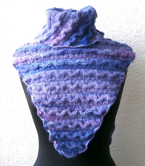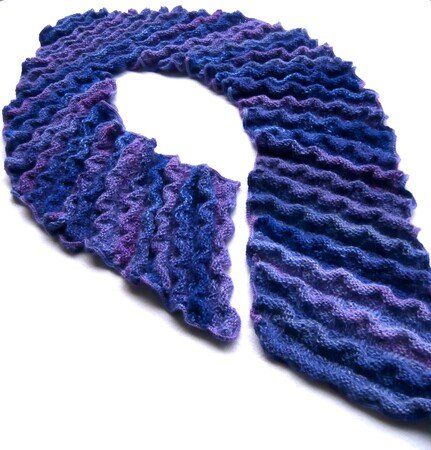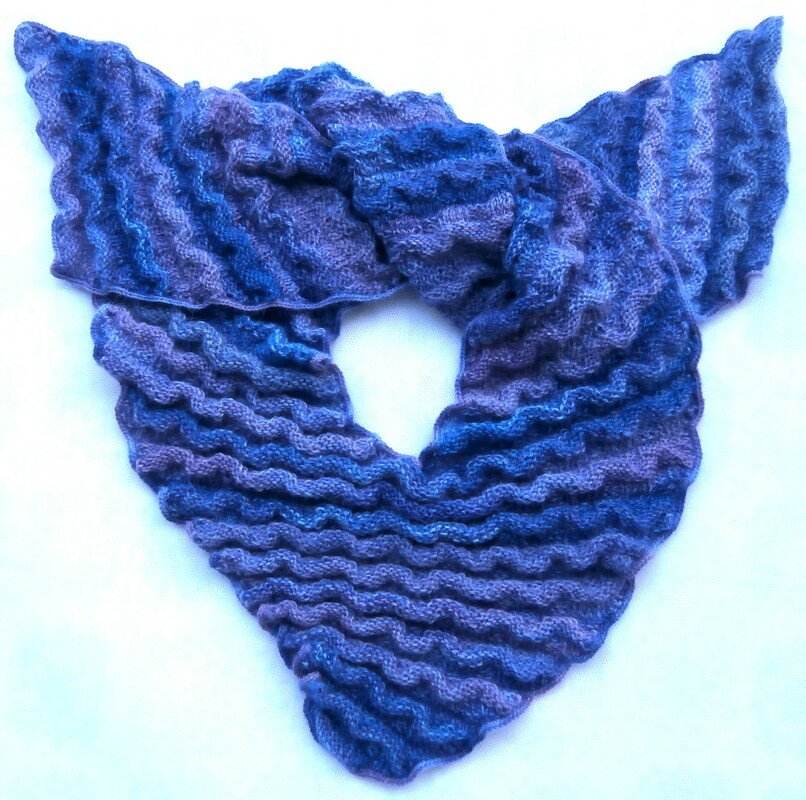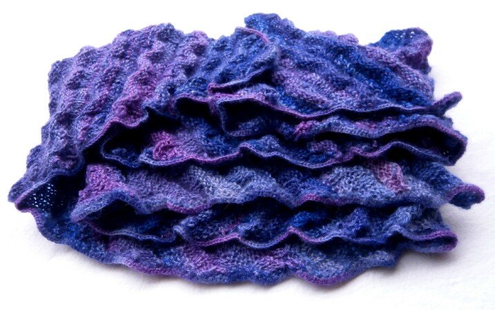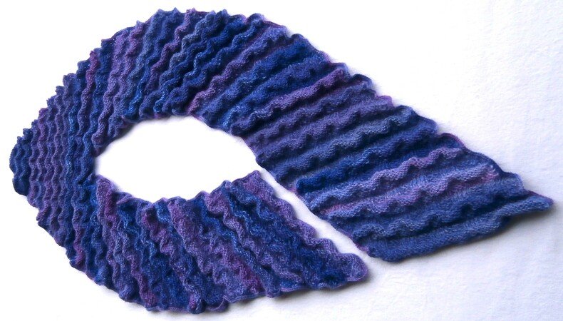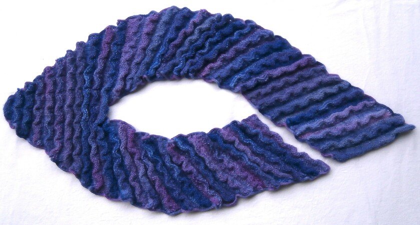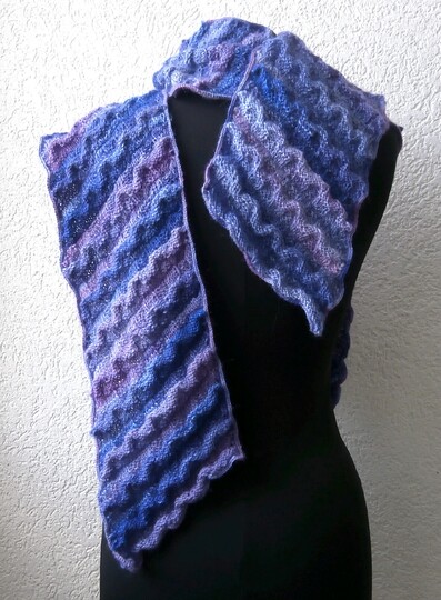 Ein ungewöhnlich geformter Schal, gestrickt in einem abwechslungsreichen Wellenmuster.
