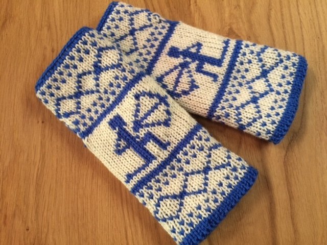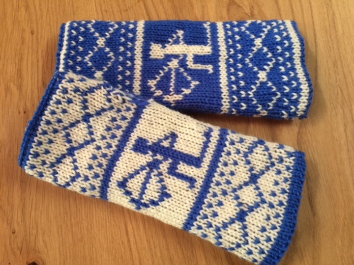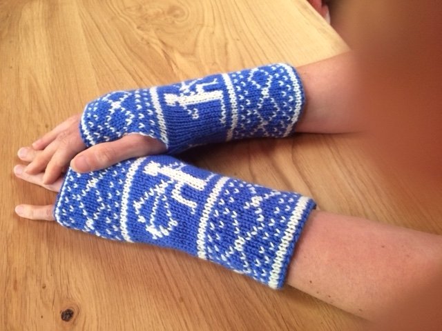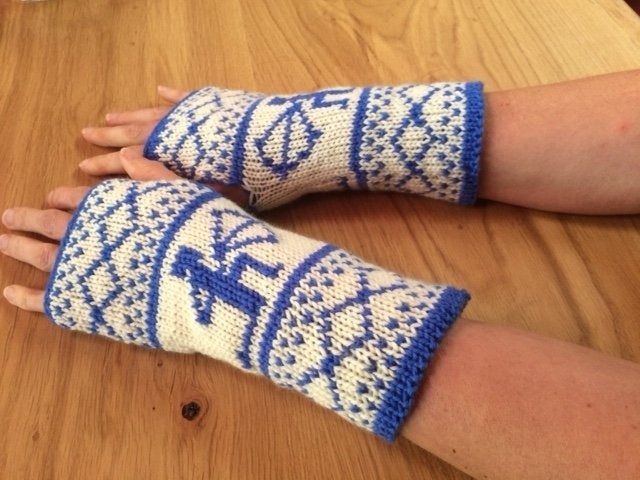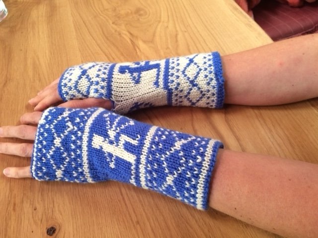 Diese Armstulpen sind in einer Technik namens double face gestrickt. Dies bedeutet, man hat innen keine Fäden gespannt, an denen man beim Anziehen auch noch hängenbleibt (und zu allem Übel vielleicht auch noch Fäden zieht!). Vielmehr kann man sie einfach wenden und hat dann keinen blauen Schützen mehr auf weißem Grund, sondern einen weißes Schützen auf blauem Grund.