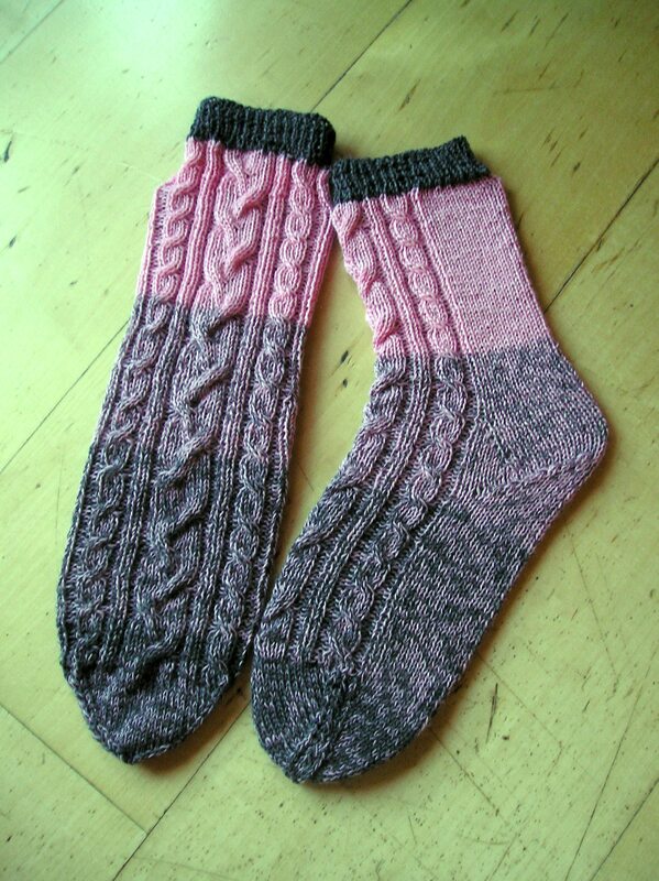 Die Socken werden mit einem Swobbel von gestrickt. Das sind 2 Farbverlaufsbobbel. die mit dem gleichen Farbverlauf gewickelt wurden. Aus denen lässt sich je ein Socken stricken. Der hintere Sockenschaft und die Fußsohle werden glatt rechts gestrickt. Am vorderen Sockenschaft und am Fußrist strickt man ein Zopfmuster. Für die Ferse wird die neue Knittelferse verwendet, die besonders gut am Fuß sitzt. Wer Zöpfe stricken kann, bekommt auch diese Socken hin.