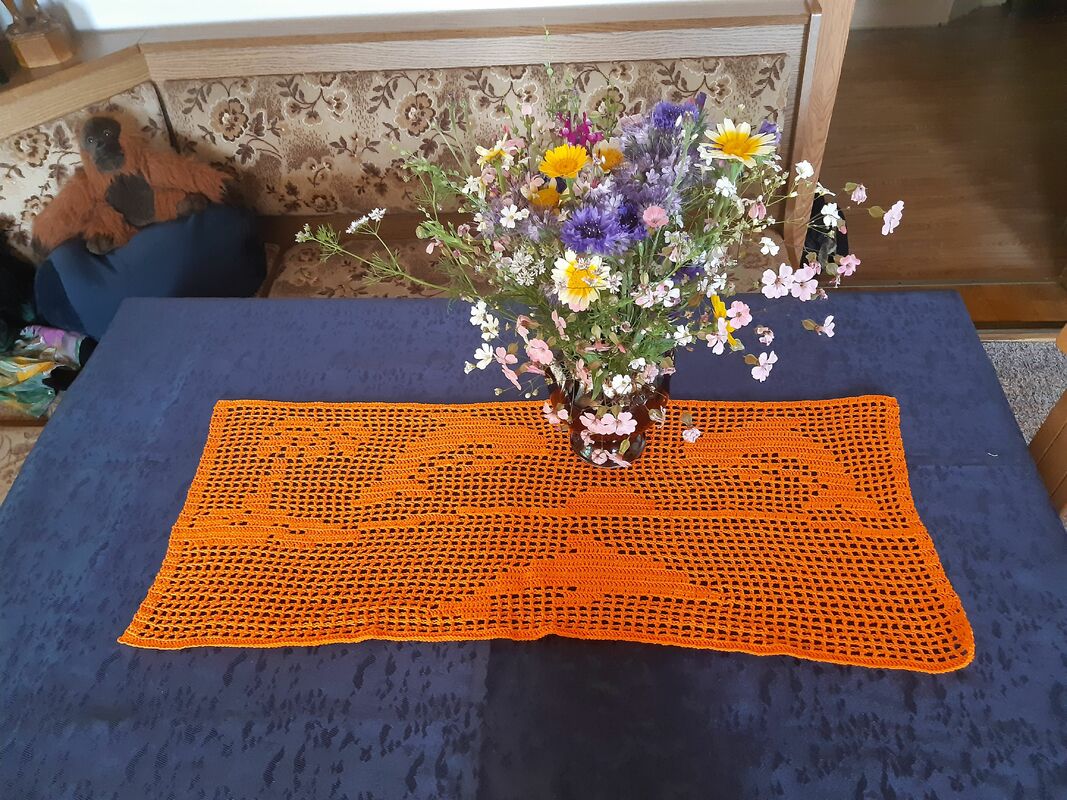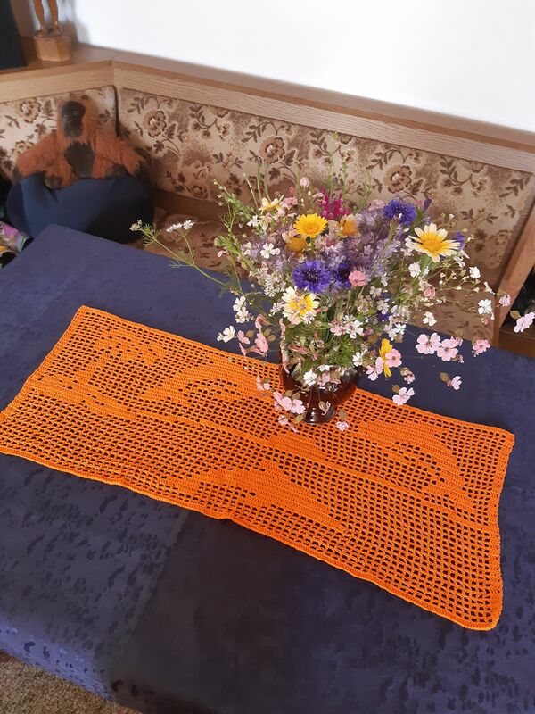 Ihr könnt selbstverständlich auch eine andere Wolle / Farbe / Nadel für den Läufer verwenden. Bitte beachtet nur, dass sich da ein anderes Maß des Tischläufers ergeben kann