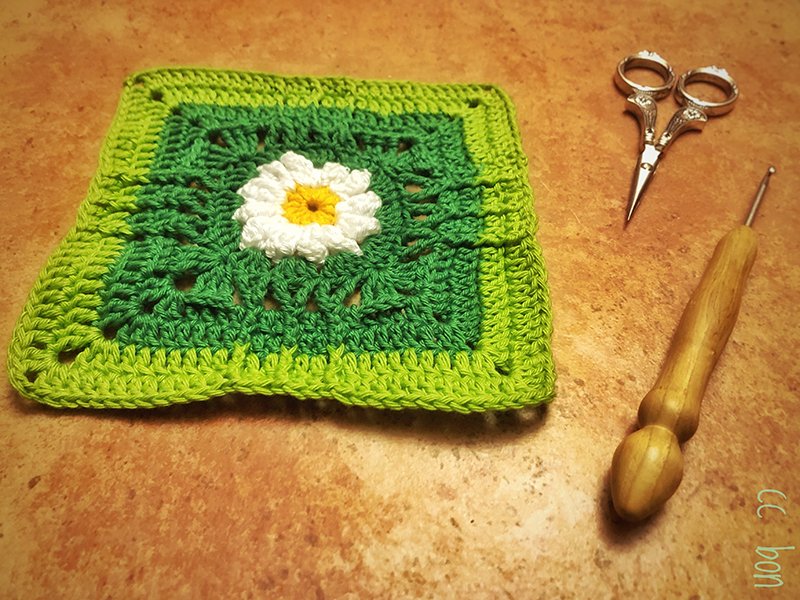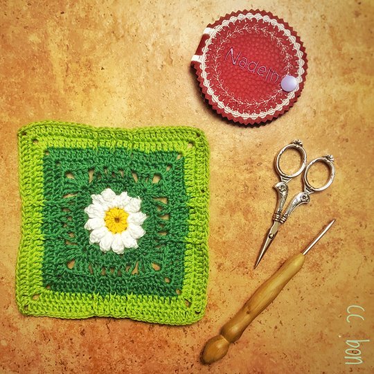 Die vorliegende Anleitung enthält eine Schritt-für-Schritt-Beschreibung für ein einzelnes Granny Square mit einer Margeriten-Blüte im Zentrum. Es wird in Runden gehäkelt. Eine Häkelschrift ist nicht enthalten.